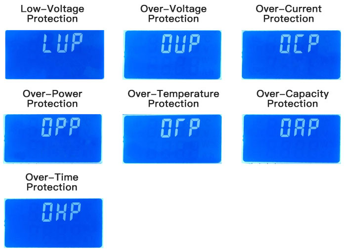 OVP: over-voltage protection (Default 38V, can be set by yourself. After over-voltage protection, RUN indicator flashes and LCD interface displays OVP. In battery charging, setting an appropriate threshold can effectively prevent battery from being overcharged);