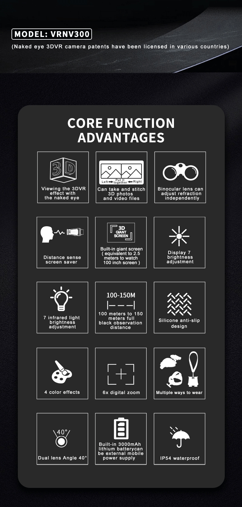 - Double eyepiece and double objective lens naked eye 3DVR technology, restore the real three-dimensional scene seen by human eyes (naked eye 3DVR camera patents have been authorized in various countries).