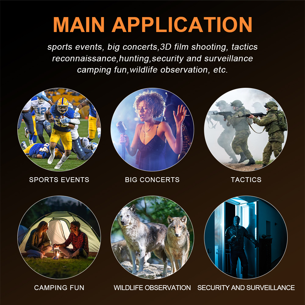 - Sports events, large-scale concerts, 3D film shooting, tactics, reconnaissance, hunting, safety and surveillance, camping fun, wildlife observation, etc.