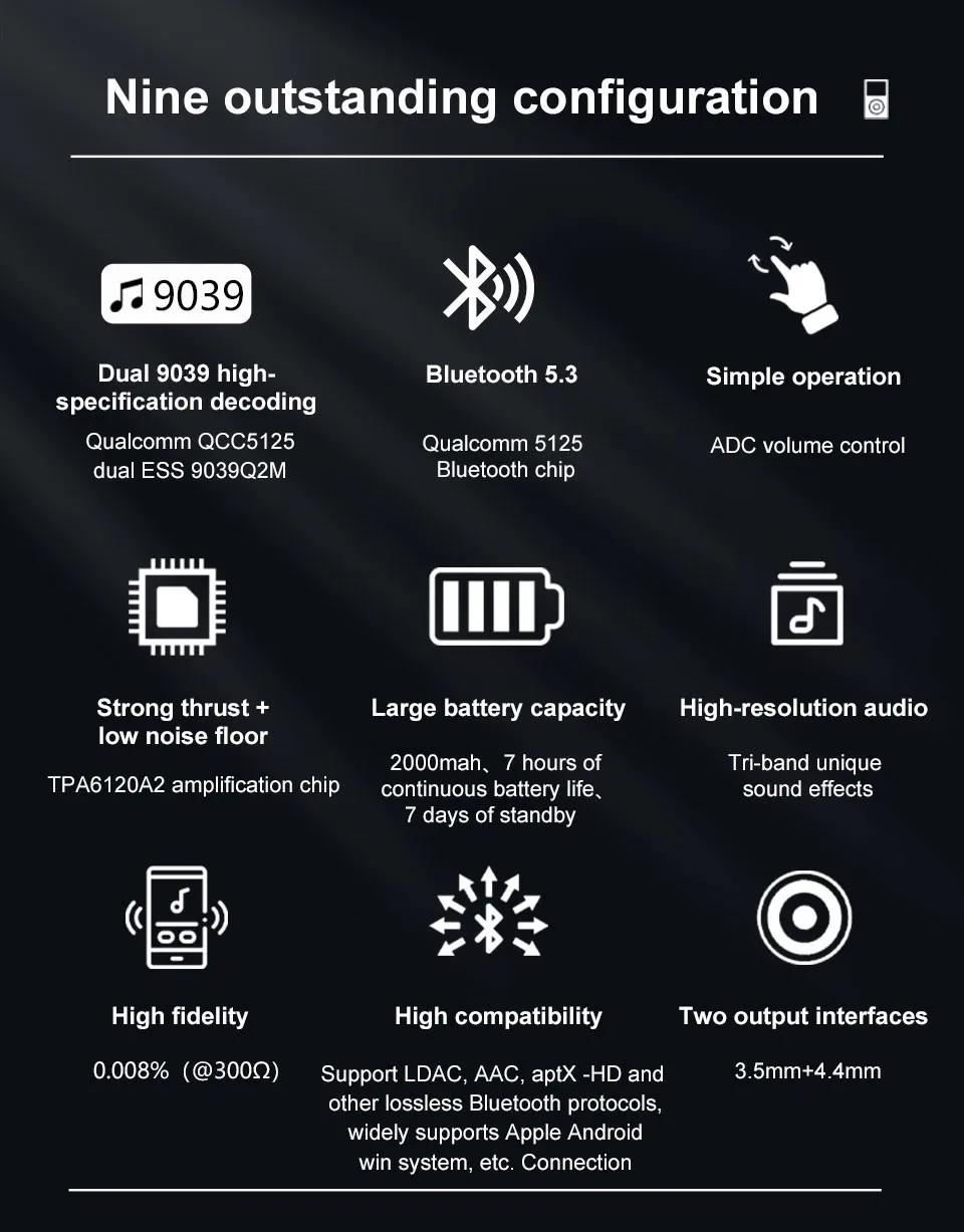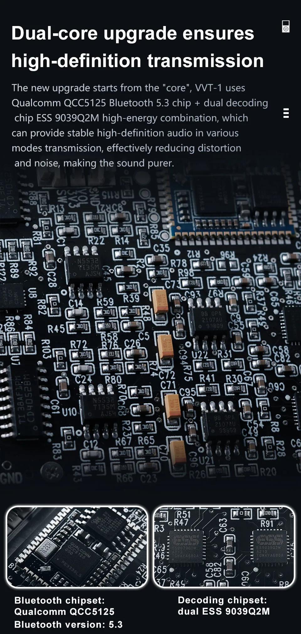 - Using for Qualcomm QCC5125 Bluetooth 5.3 chip and dual decoding chip for ESS9039Q2M high-energy combination to achieve stable high-definition audio transmission in various modes, effectively reducing distortion and noise, and making the sound purer.