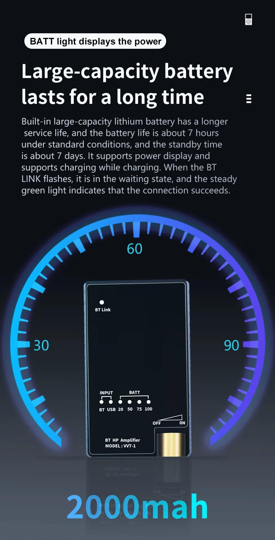 - Equipped with a large capacity lithium battery, it has a longer lifespan, with a continuous battery life of about 7 hours under standard conditions and a standby time of about 7 days. It supports battery level display and can be used while charging. When BT LINK flashes, it is in a standby state, and a constant green light indicates successful connection.