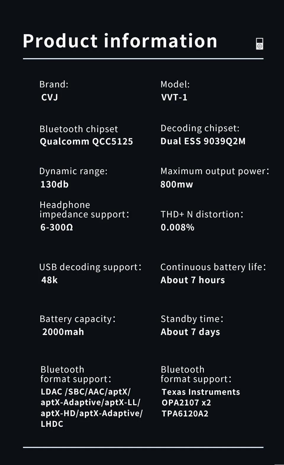 - Supports various high-definition Bluetooth audio protocols for LDAC, SBC, AAC, aptX, aptX Adaptive, aptX LL, aptX HD, aptX Adaptive, LHDC, etc.