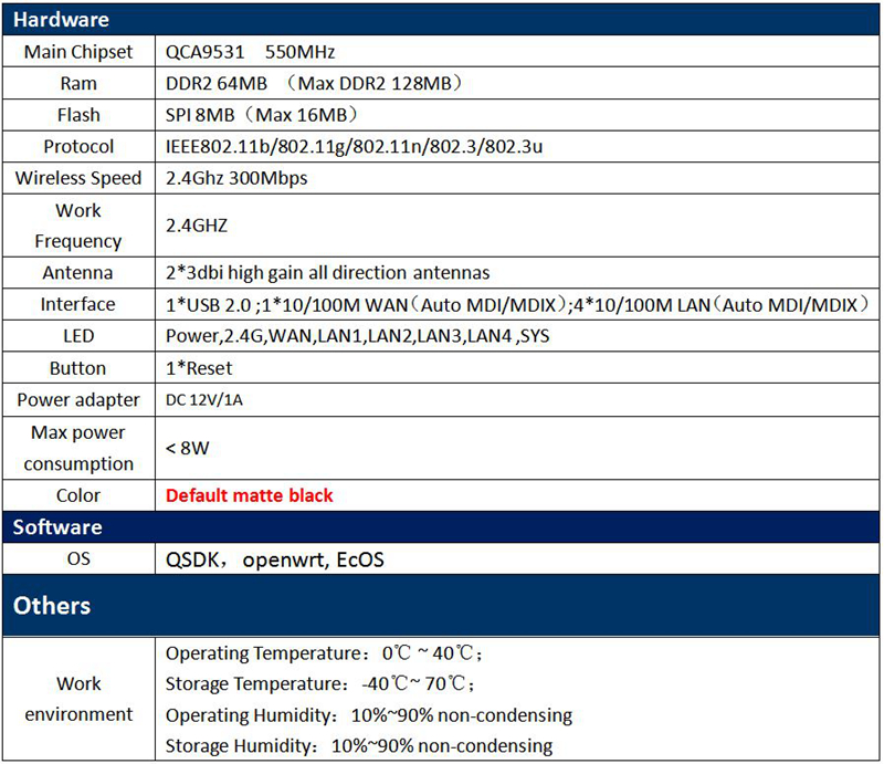 - Wireless TX: 802.11b 25dBm±2dBm, 802.11g 23dBm±2dBm, 802.11n 21dBm±2dBm