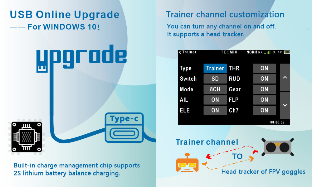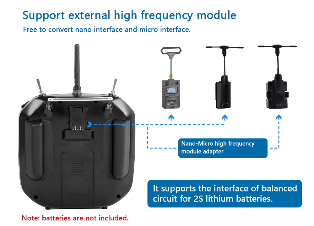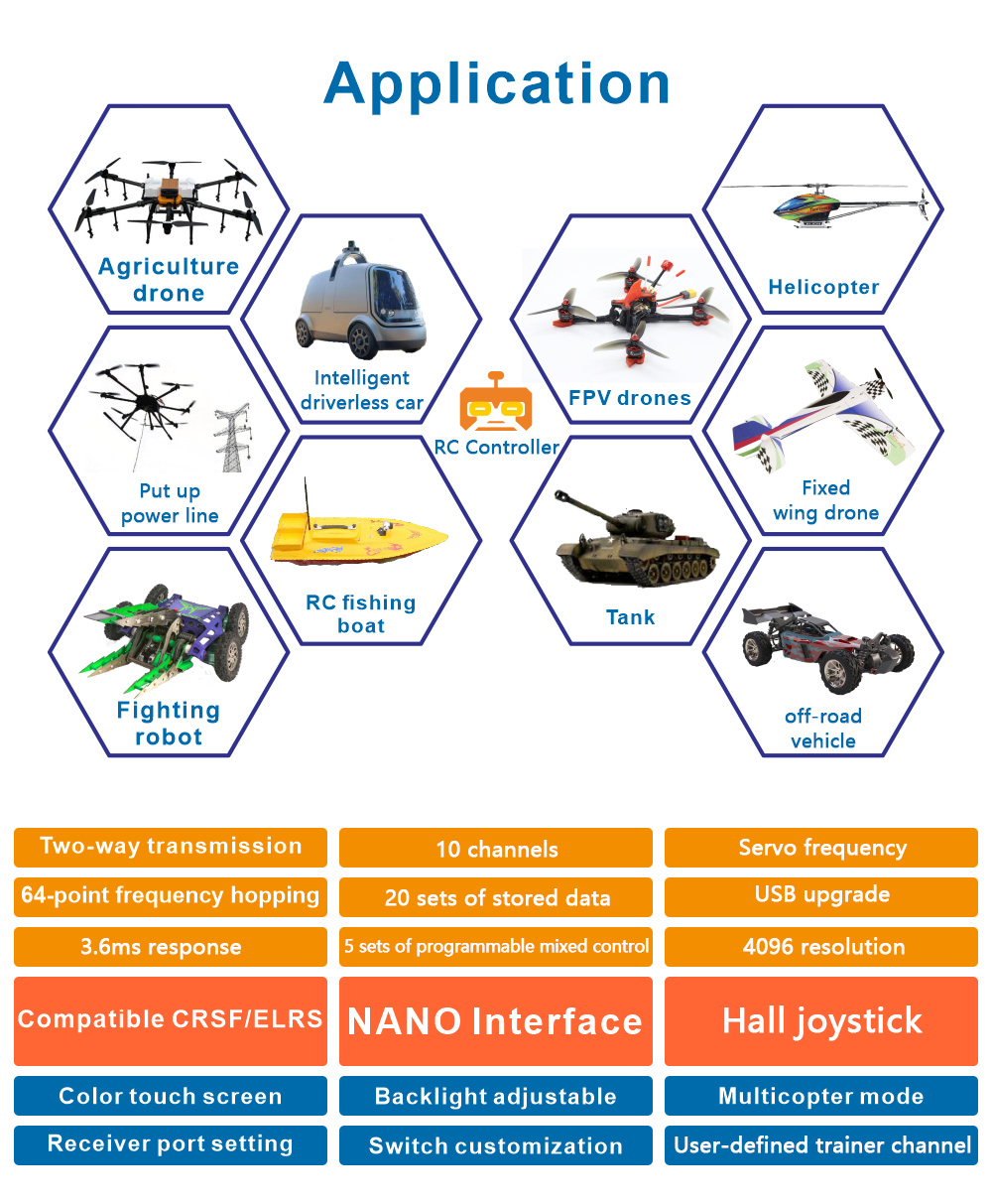 ET10 is upgraded from ET07. It enables full proportion of 10 channels. It is added with a NANO interface for high frequency module. It is compatible with ELRS and TBS. It boasts Hall joysticks, a type-c interface and an appearance of liquid metal.