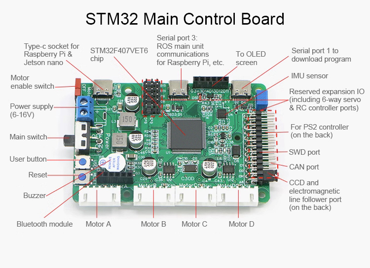 - Expansion interface: CAN, CCD, electromagnetic line follower, etc.