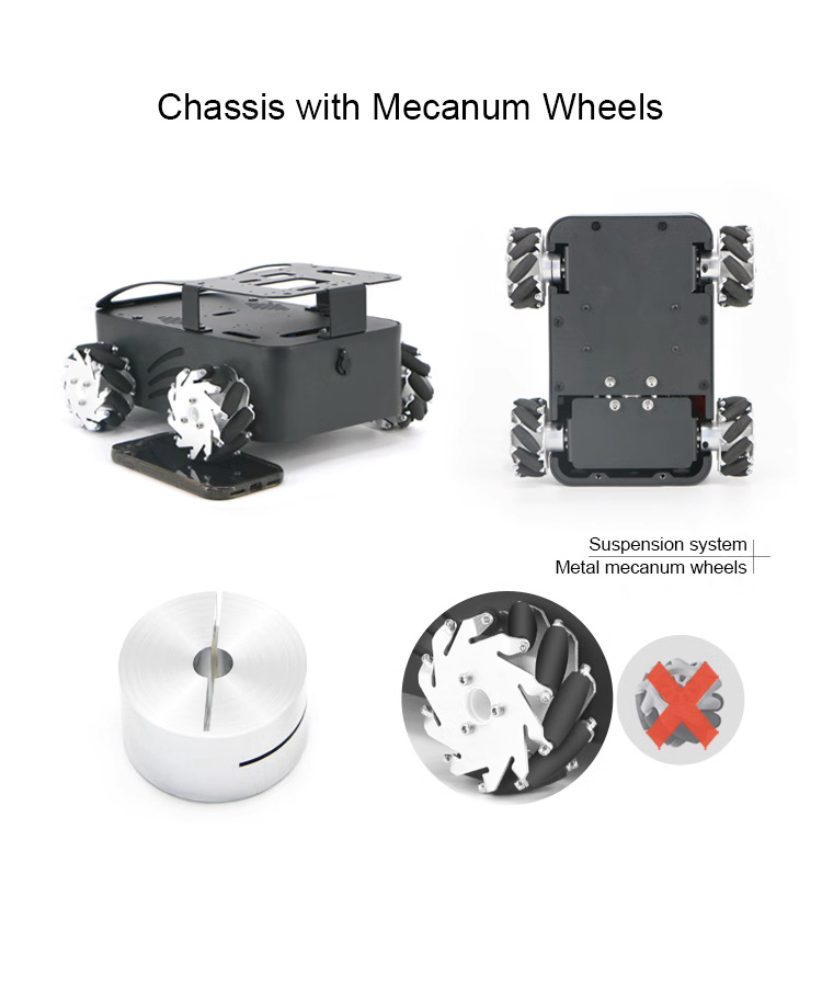 The whole chassis is fully metal-machined. Mecanum wheels are made of metal, and their accuracy and life are better than those of plastic mecanum wheels. The chassis is also equipped with a high-precision suspension system to adapt to uneven ground. The robot car also adopts a tight-fitting coupling, so you no longer have to worry about the wheels coming off.