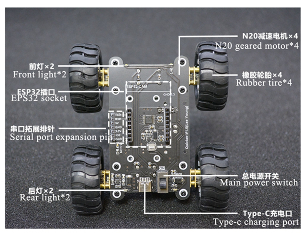 - It adopts ESP32CAM module as the main control, with a download base plate, and can be plugged and unplugged on the main board. AS a low power consumption CPU, ESP32 has a main frequency of 240MHz, and it is widely used to multiple IOT application.