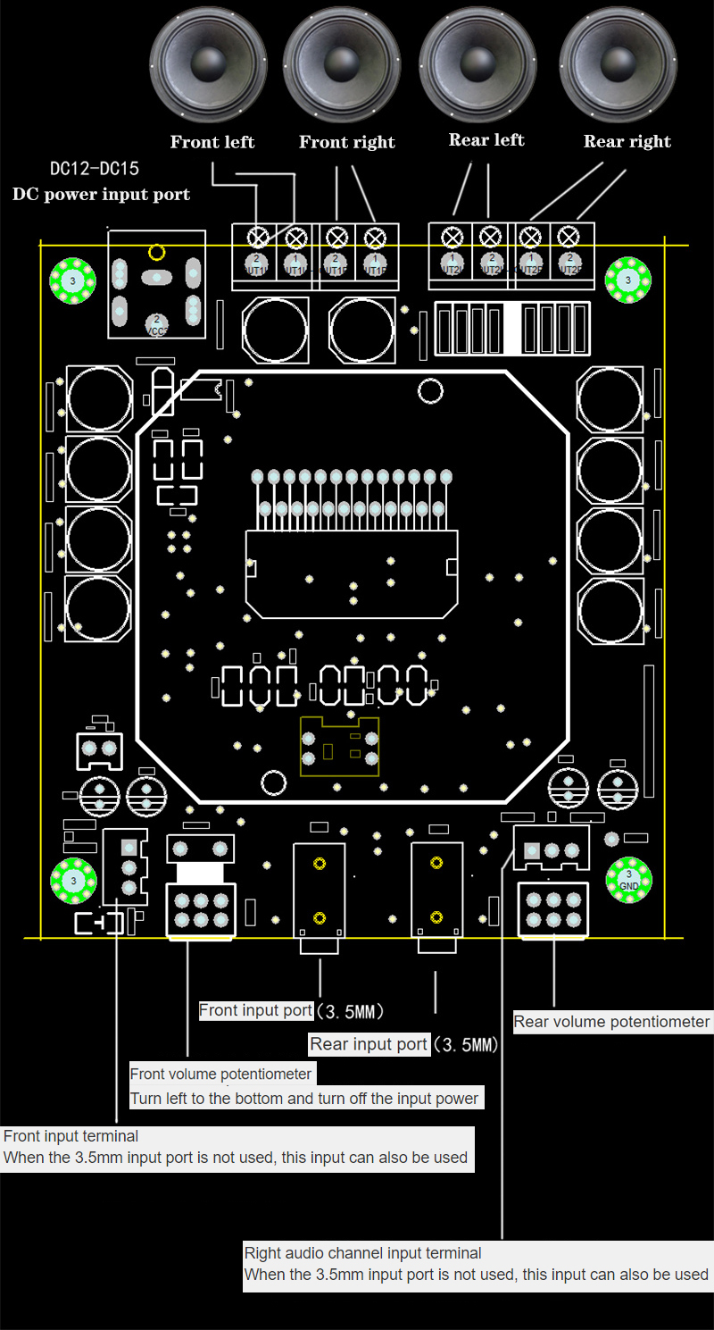 - When the potentiometer switch at the bottom of the PCB is ON, you can only input the front input signal, and the rear volume potentiometer is turned to the maximum, and the front and rear volume are uniformly adjusted by the front volume potentiometer.