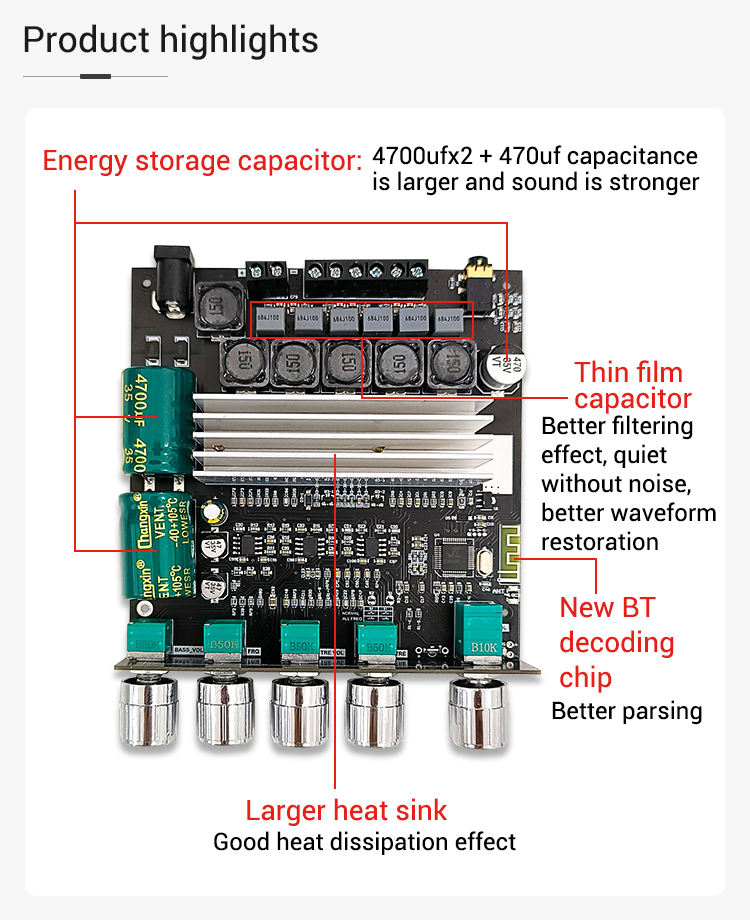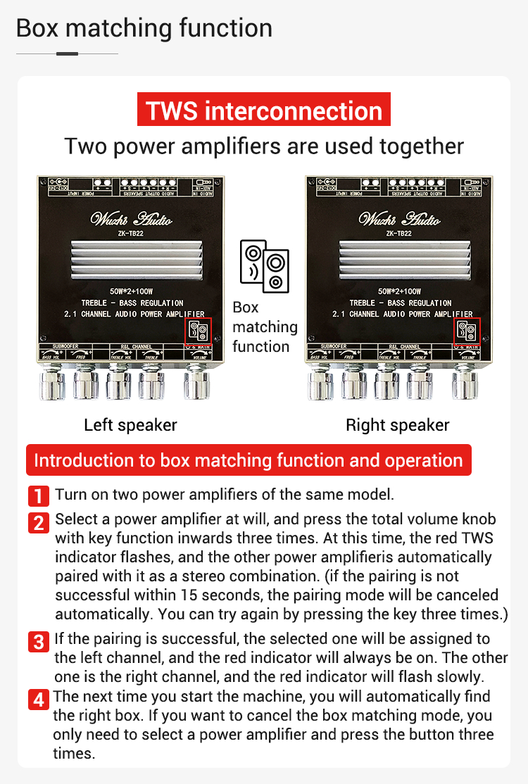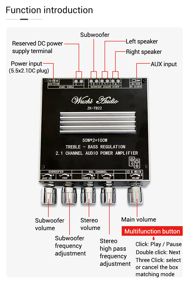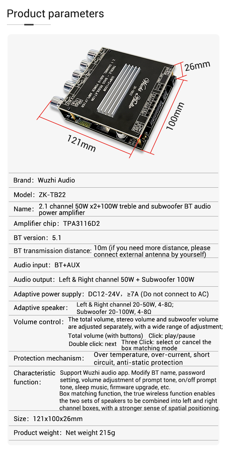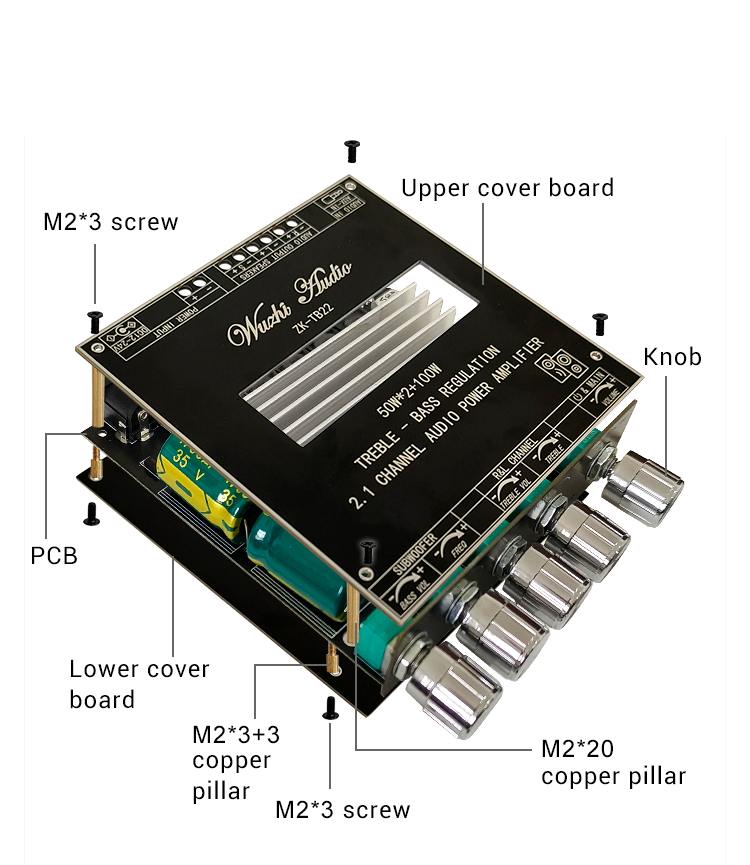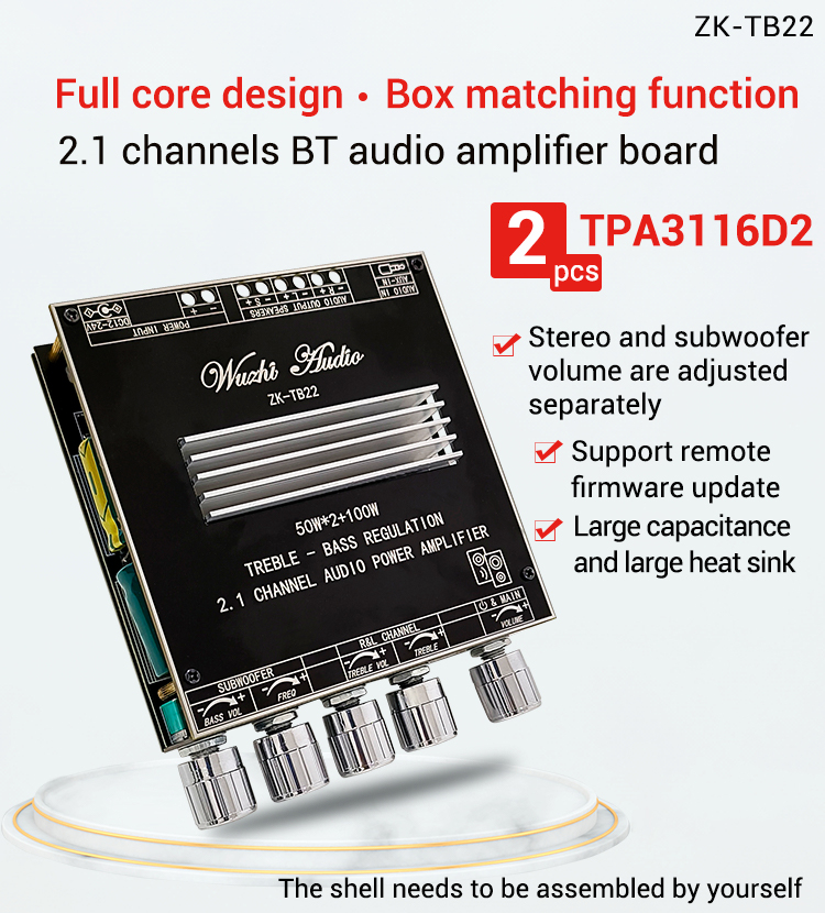Wuzhi Audio ZK-TB22 2.1 Channel Audio Power Amplifier Bluetooth Power Amp TWS TPA3116 with Shell