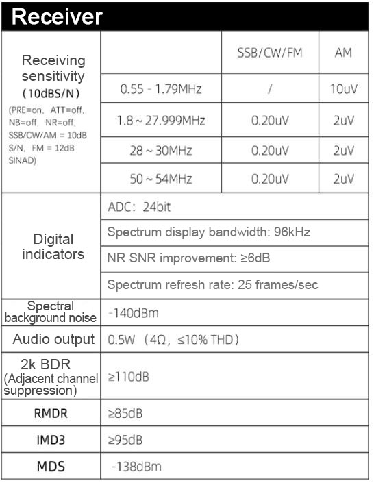 - Frequency range: Receiving: 0.5MHz~30MHz, 50MHz~54MHz; Transmitting: 1.8~2.0MHz, 3.5~3.9MHz, 5.3515~5.3665MHz, 7.0~7.2MHz, 10.1~10.15MHz, 14.0~14.35MHz, 18.068~18.168MHz , 21.0~21.45MHz, 24.89~24.99MHz, 28.0~29.7MHz, 50~54MHz