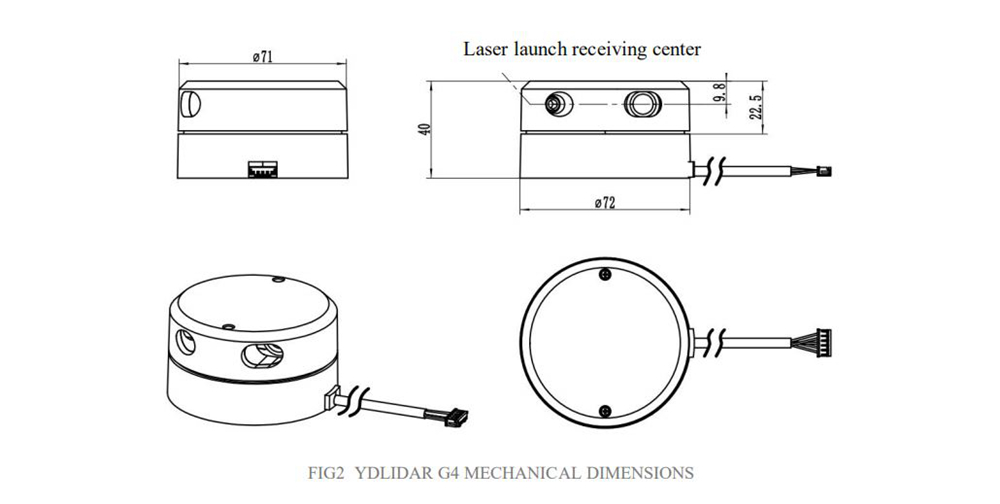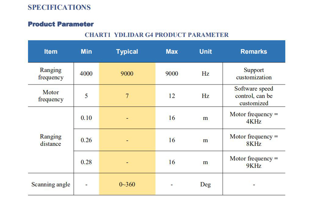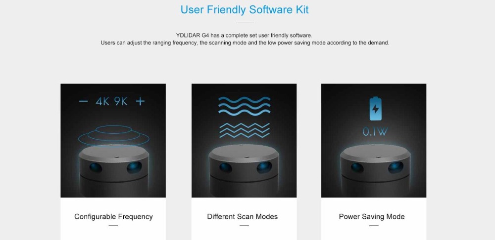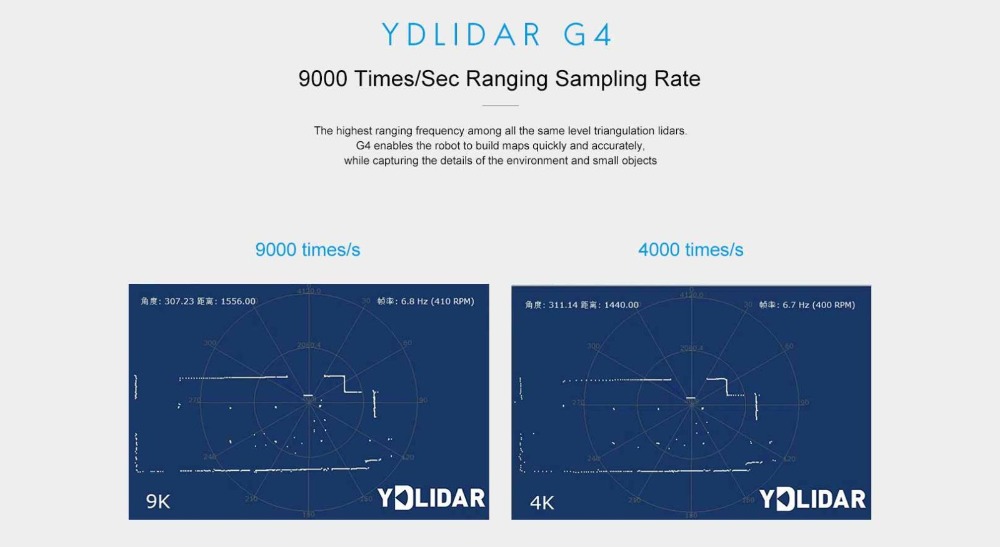 YDLIDAR G4 is a 360-degree two-dimensional rangefinder (hereinafter referred to as G4). Based on the principle of triangulation, it is equipped with related optics, electricity, and algorithm design to achieve high-frequency and high-precision distance measurement. The mechanical structure rotates 360 degrees to continuously output the angle information as well as the point cloud data of the scanning environment while ranging.