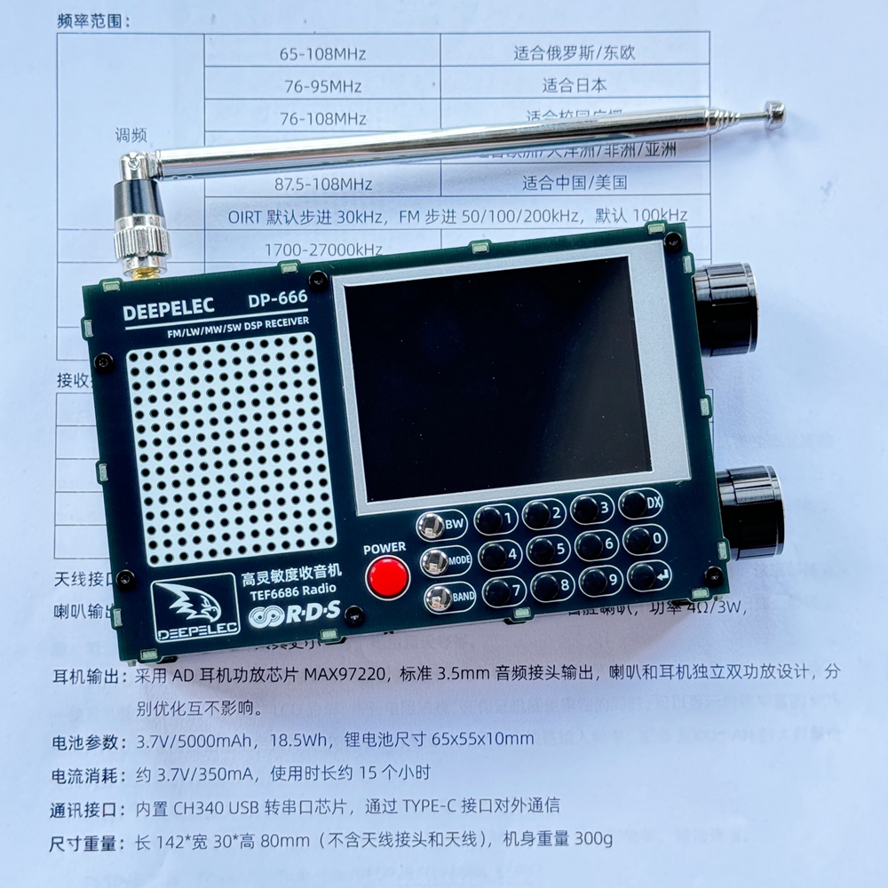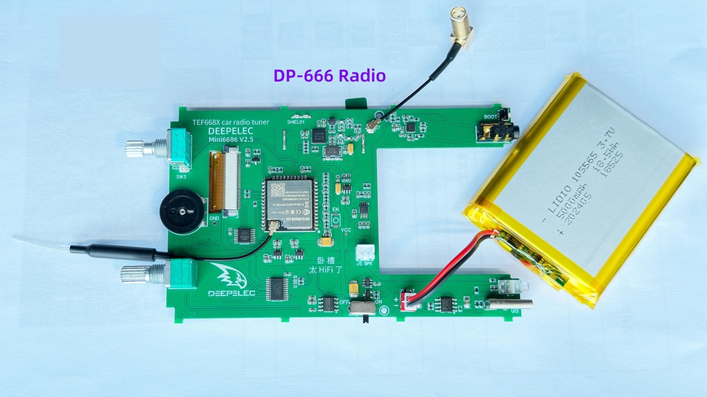 - We redesigned the circuit board with reference to the mature TEF6686 front-end receiving circuit, and equipped the DP-666 with a 2.8-inch LCD color screen with resistive touch based on the open source project. While ensuring the portability of the machine, it can display rich RDS information (RDS information requires local radio support); a numeric keypad is added to facilitate users to quickly input frequencies; and a large-capacity 5000mAH battery supports longer standby time.