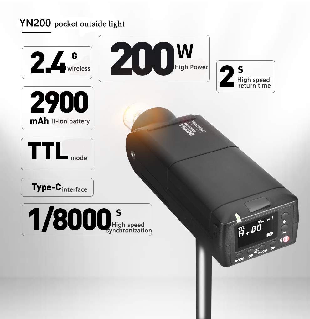 YONGNUO YN200 Flash Light TTL HSS Speedlite 5600k 200W GN60 Lithium Battery For Canon Nikon Cameras