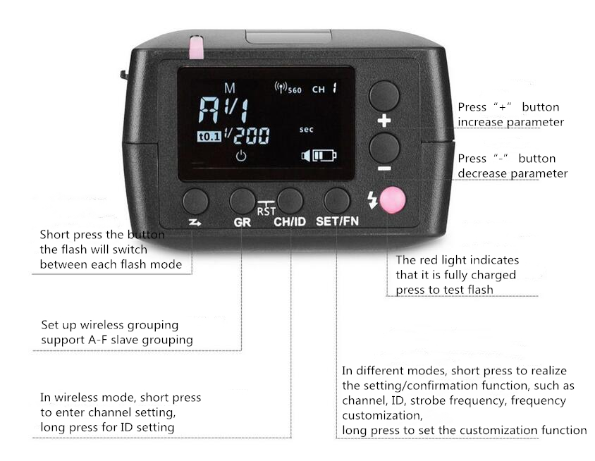 Flashing Mode: radio flash mode, optical transmission mode, S1 S2 synchronous interface trigger