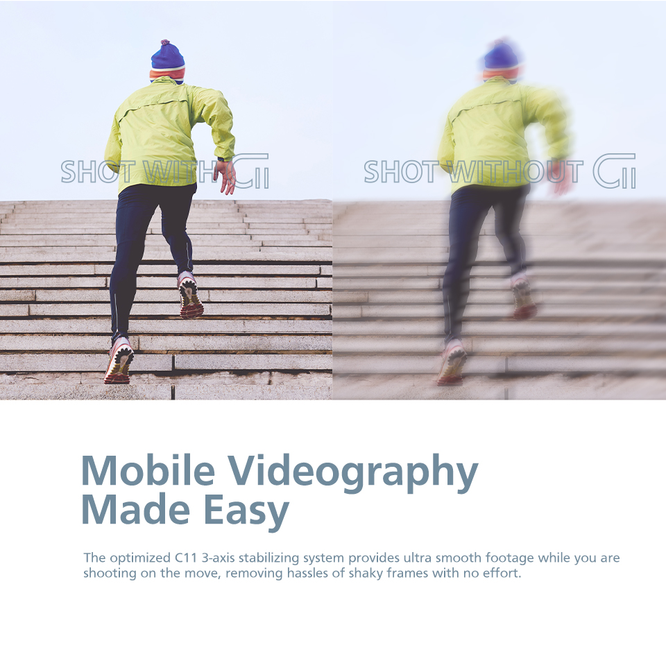 The optimized 3-axis stabilization system of the C11 effortlessly eliminates shaky frames, providing silky smooth footage when you are following, walking, or running.