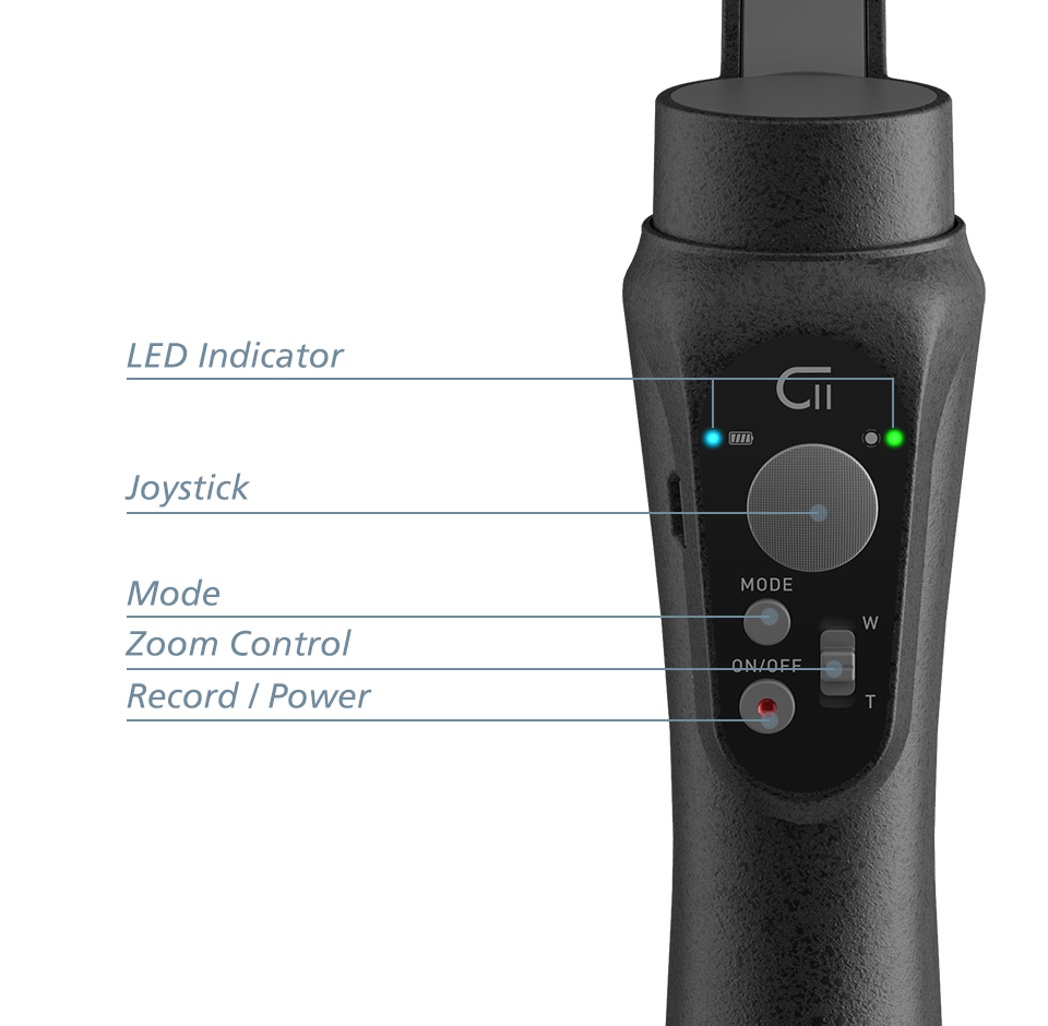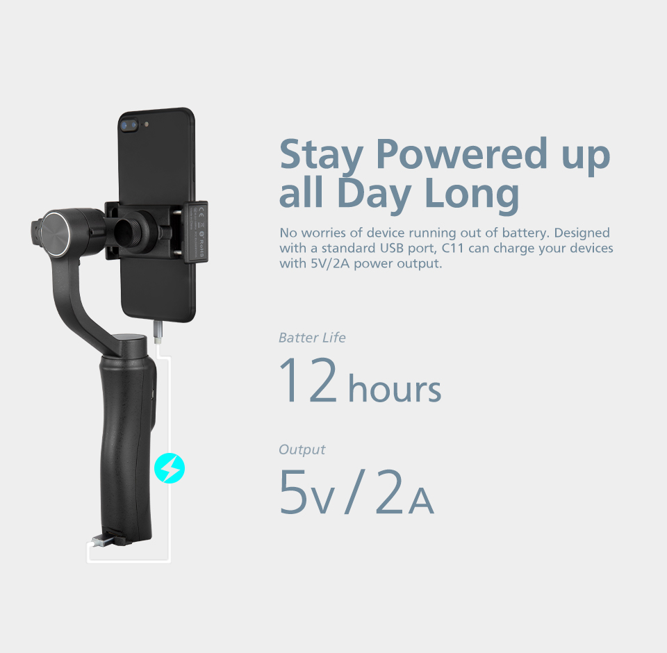The C11 comes with a small body but superior capacity. The built-in battery supports up to 12 hours of runtime, also it supports to charge your phone using the USB port underneath the handle. You can shoot outside without worrying about power being drained. The standard USB port allows you to charge your smartphone during shooting with a 5V/ 2A power output.