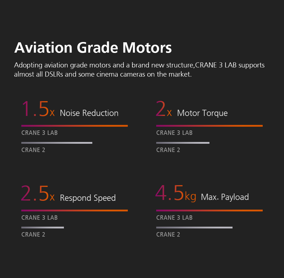 2. Cameras whose weights are within the bearing range of CRANE 3 LAB and can be balanced on it are workable with CRANE 3 LAB.