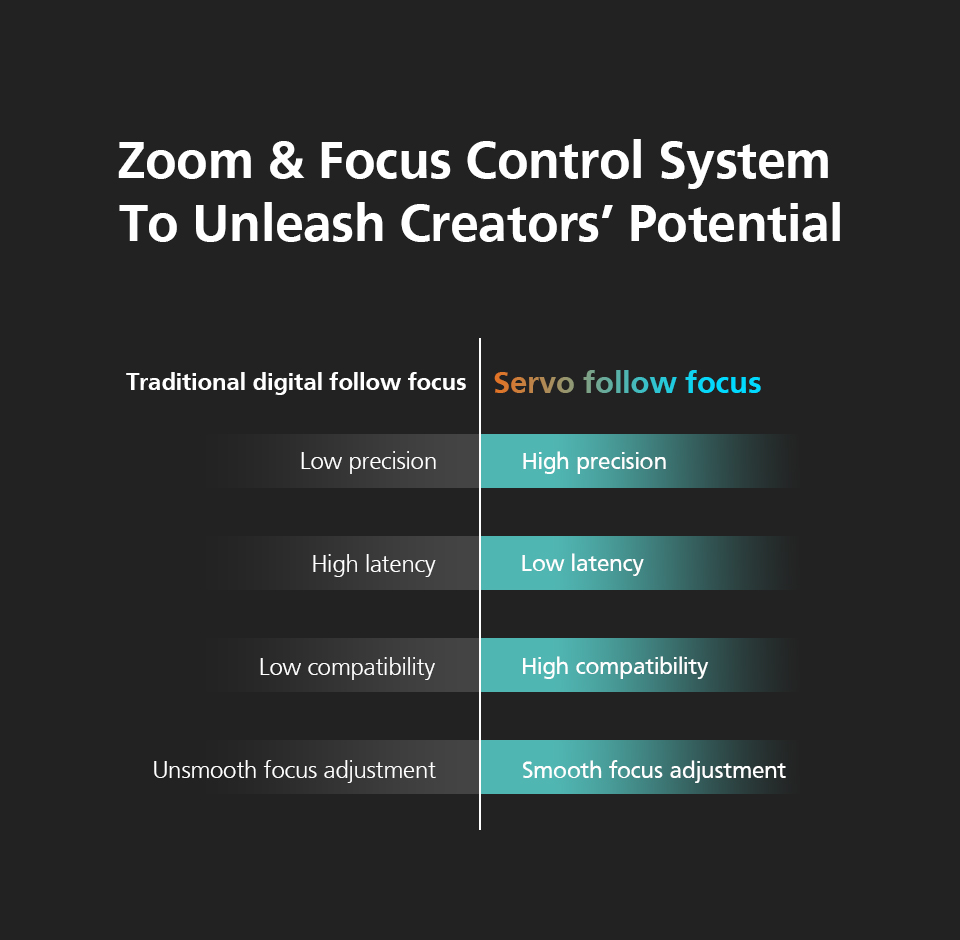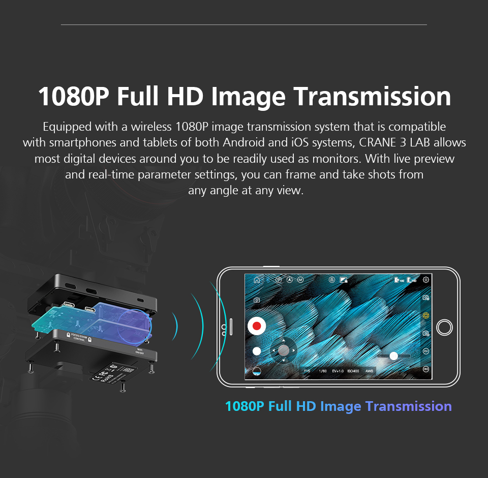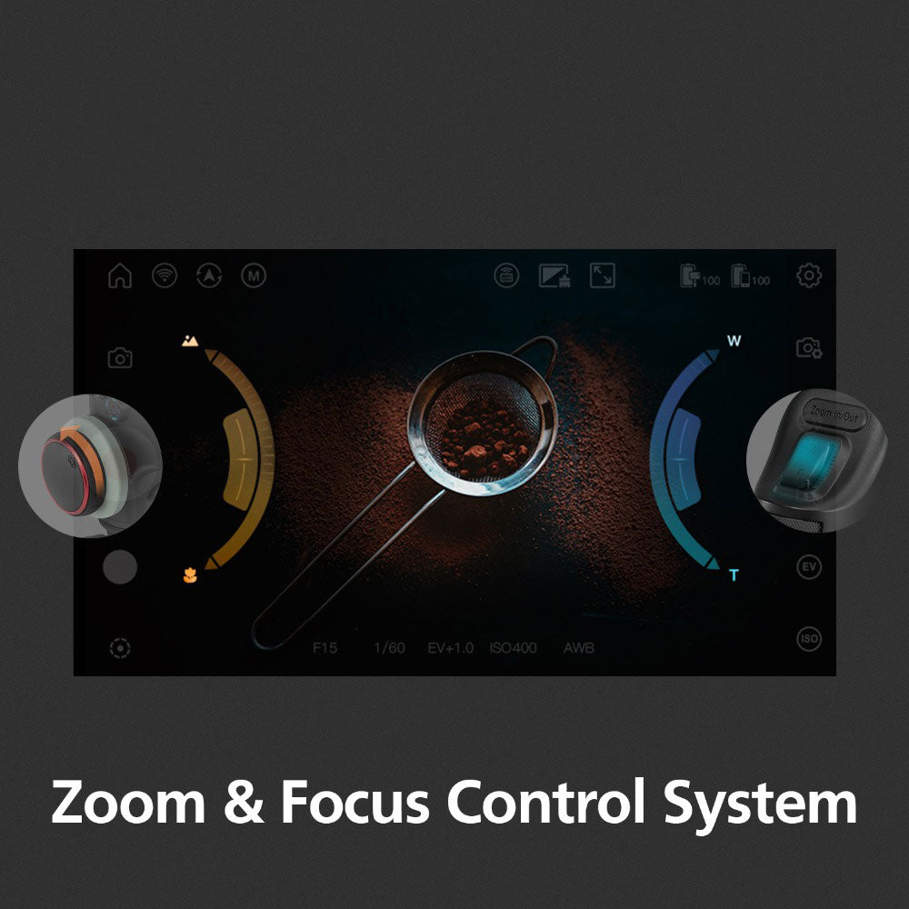 7. Focus and Zoom Control: Equipped with both focus and zoom modules, CRANE 3 LAB allows synchronous zoom and focus adjustment via the tactile wheel or touch screen of mobile phones.