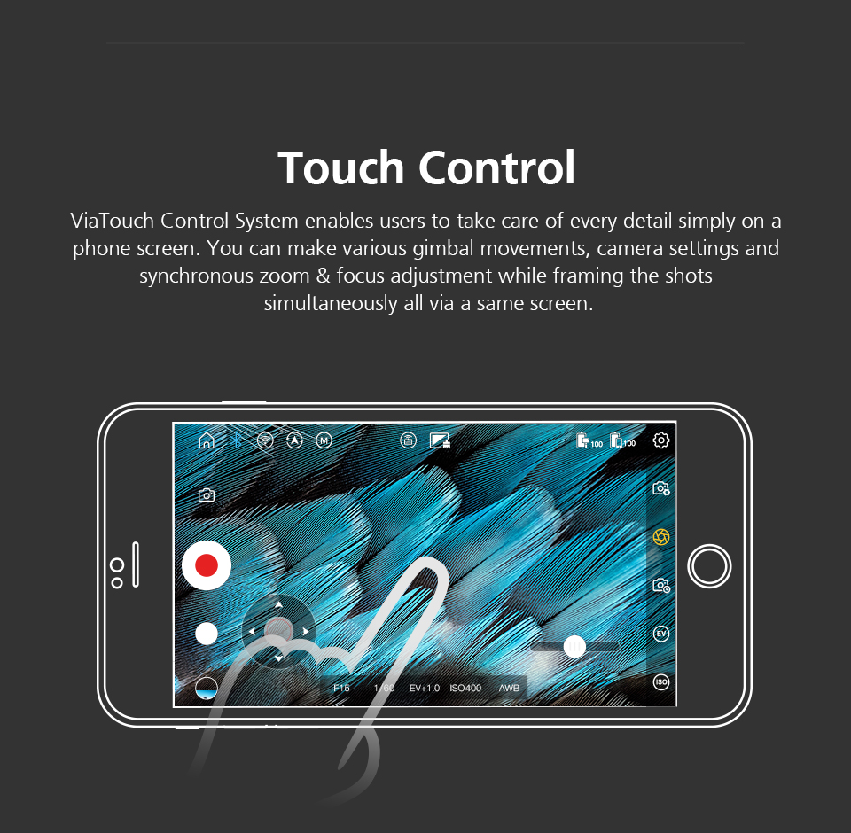 4. ViaTouch Control System: ViaTouch control system enables users to take care of every detail simply on a phone screen. You can make various gimbal movements and camera settings while framing the shots simultaneously all via the same screen. Filming on a camera would just be as easy as filming on a phone.
