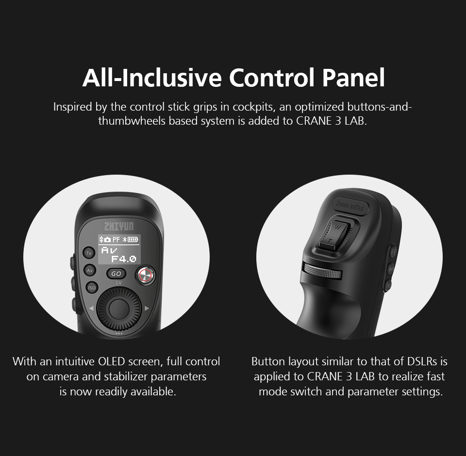 5. All-inclusive Control Panel: Multiple buttons and thumbwheels are added to CRANE 3 LAB. With these super functional tools and an intuitive OLED screen, you can easily perform full control on both gimbal and camera including mode switch, camera control, and various customized gimbal settings.