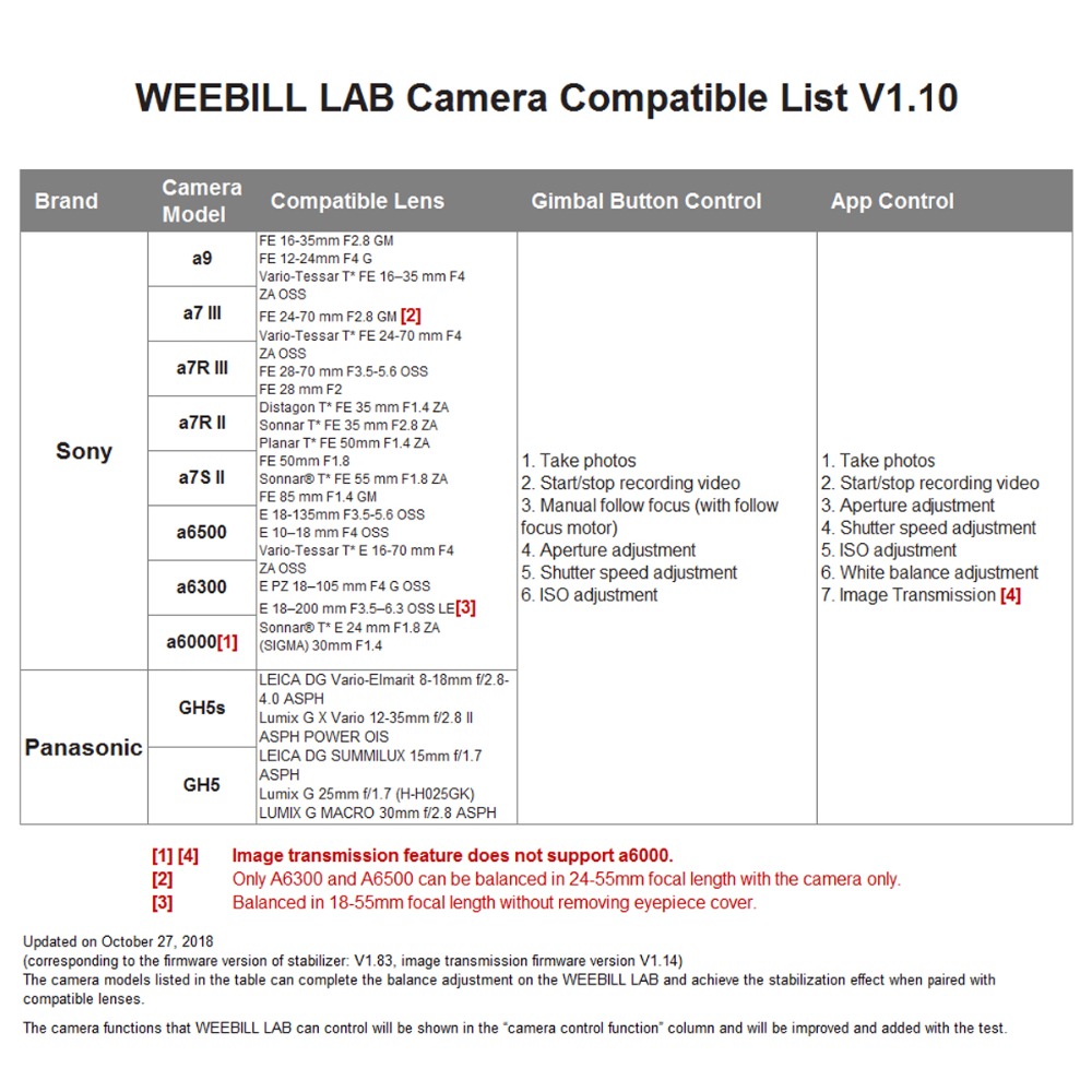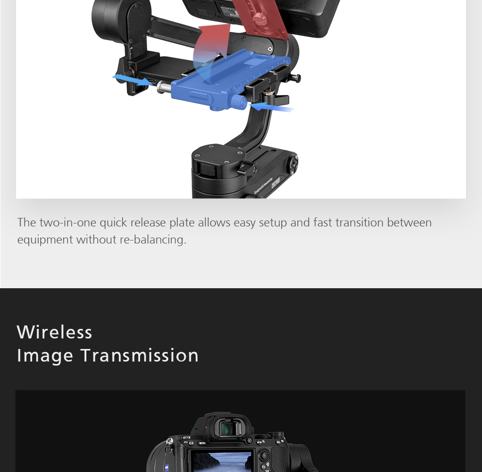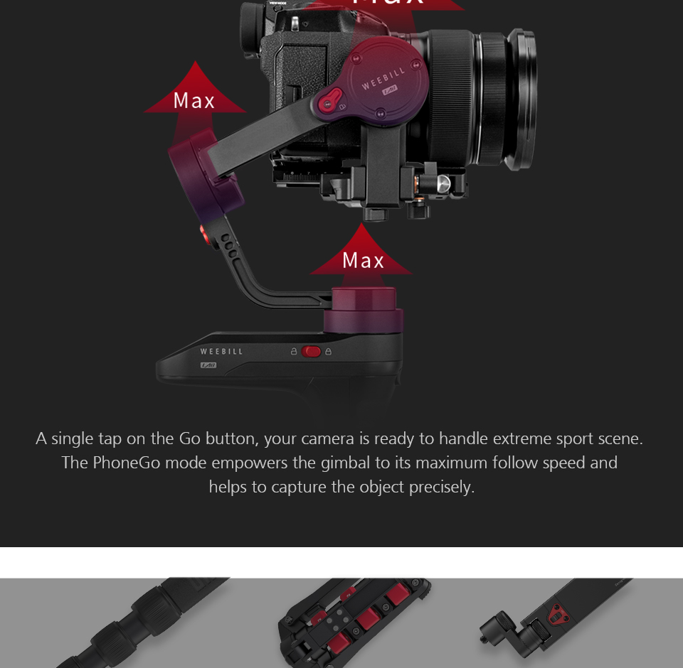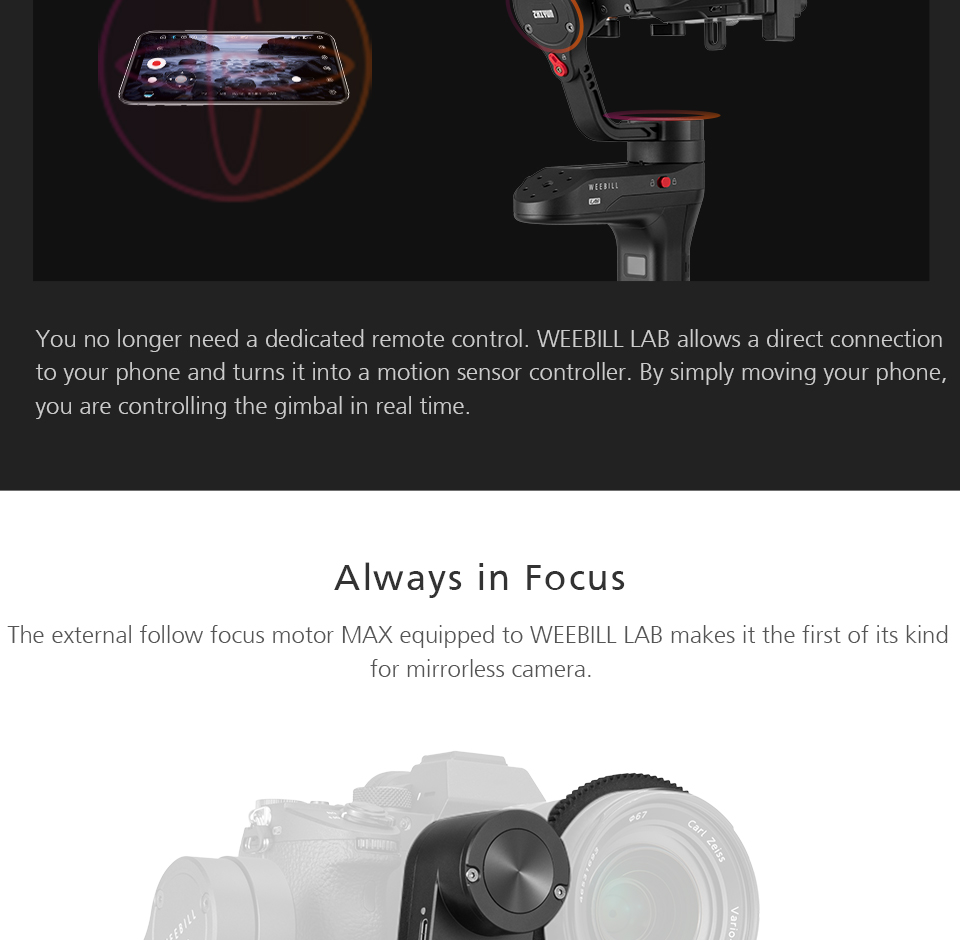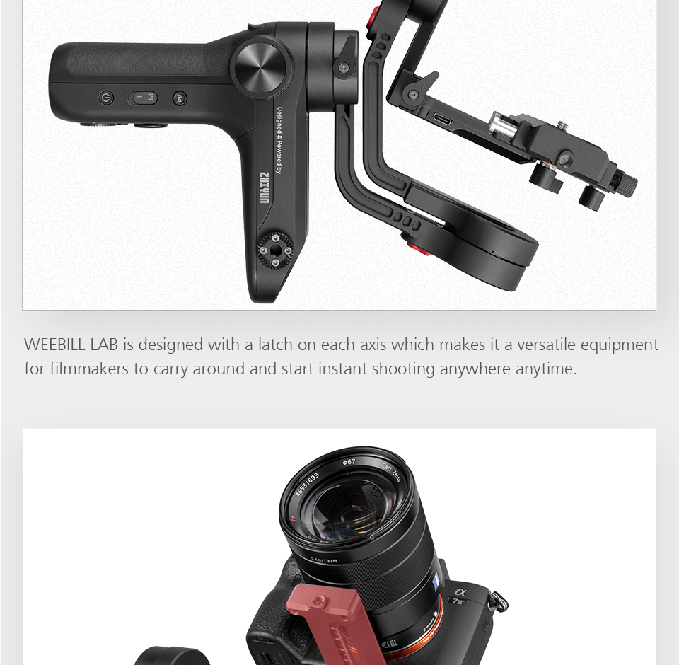 1.The Zhiyun WEEBILL LAB handheld stabilizer supports cameras weighing up to 6.6 pounds. It features a removable hand-held tripod which can be mounted on the battery bin as a grip, providing additional functionality, as opposed to crowding all the controls on the primary handgrip. The gimbal has a nominal runtime of 10 hours and requires two 18650 batteries. It is built using aviation-grade motors. The WEEBILL LAB allows you to connect and control select cameras via an included cable, and supports wireless transmission of the camera's video via Wi-Fi. 2. Control the gimbal and camera the ViaTouch control system.