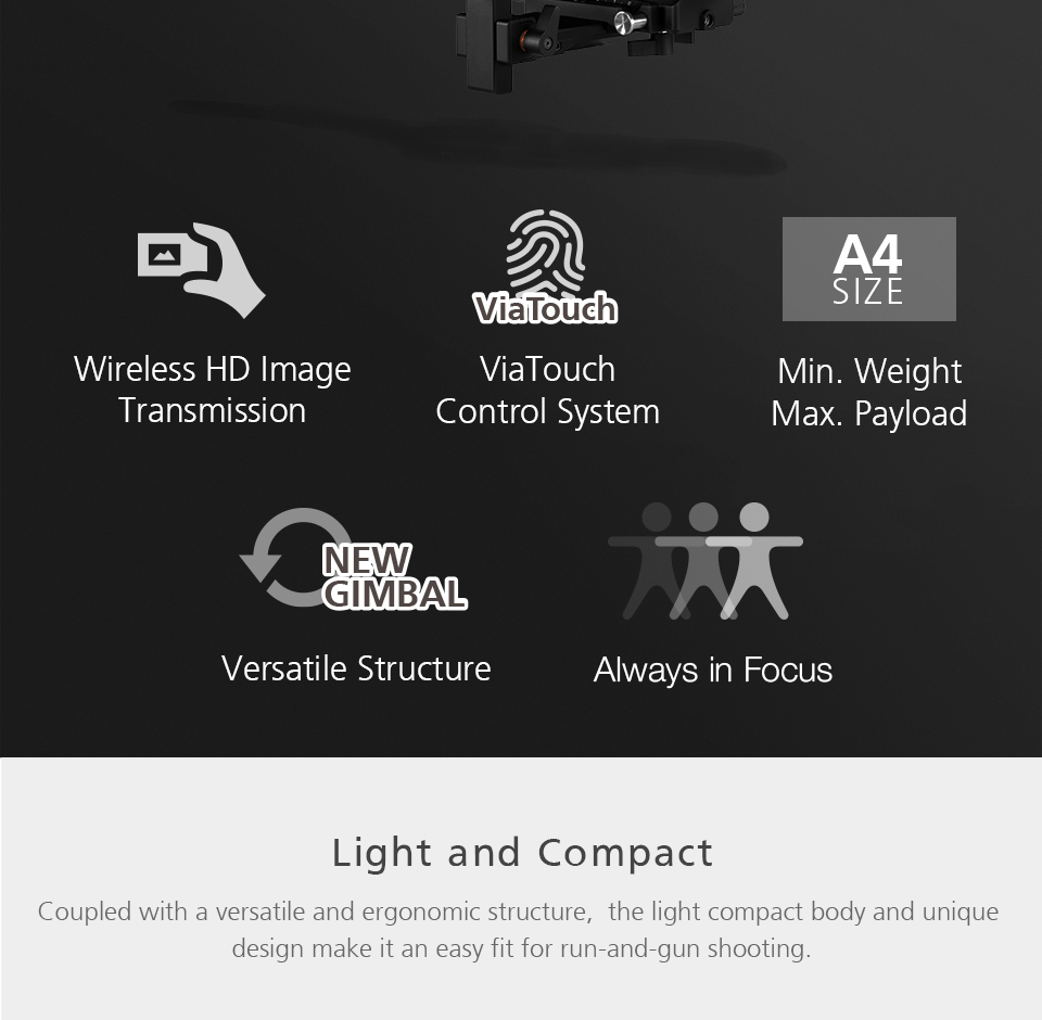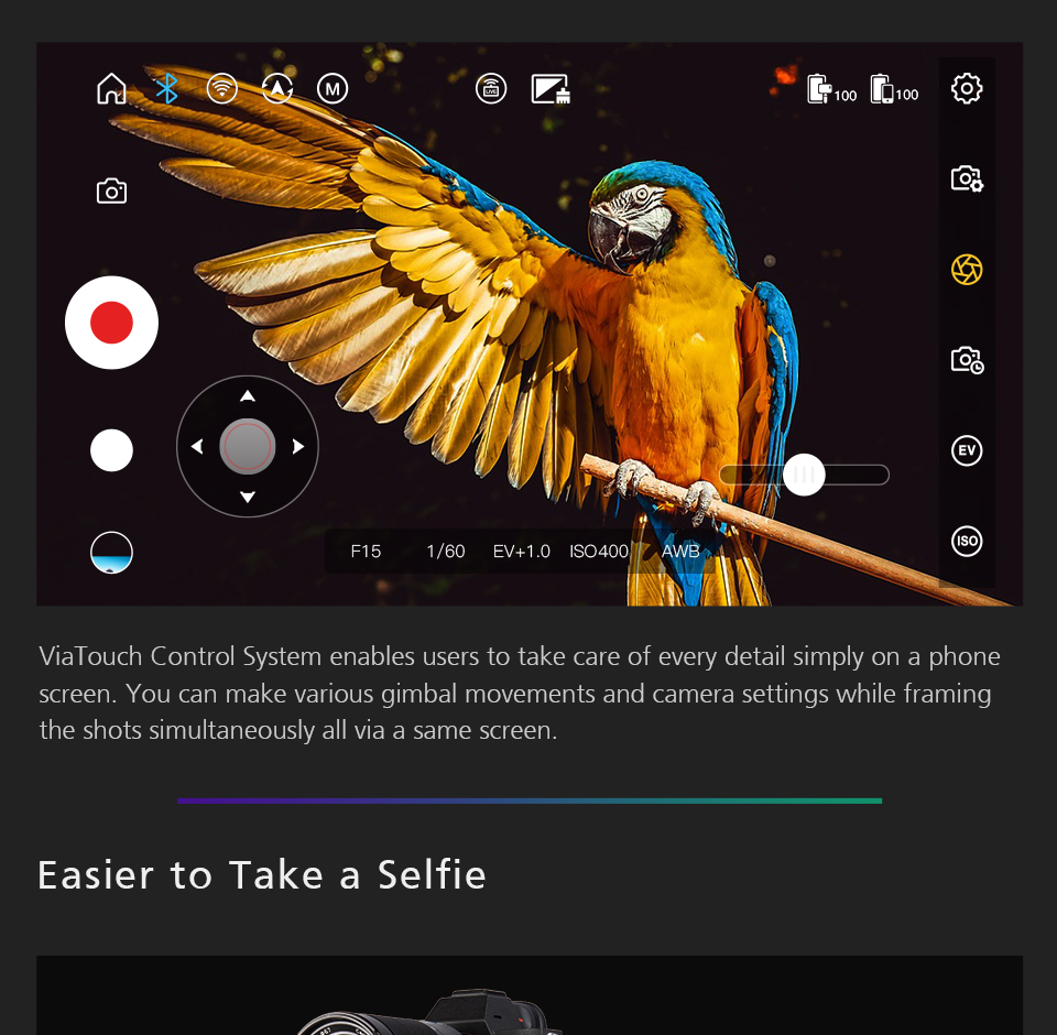 6.The ViaTouch control system enables you to use phone screen to make gimbal movements and adjust camera settings, all while framing the shot.