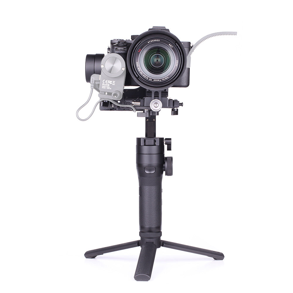 2.The gimbal features pan follow, full follow, locking mode, PhoneGo mode, Vortex mode,and POV mode. An included lens support is useful when working with long lenses, and an external follow focus motor (not included) for pulling focus on manual lenses. A downloadable app allows you to fine tune and control the gimbal wirelessly. The included removable tripod holds the gimbal upright while balancing and folds to become an extension to the main handle.