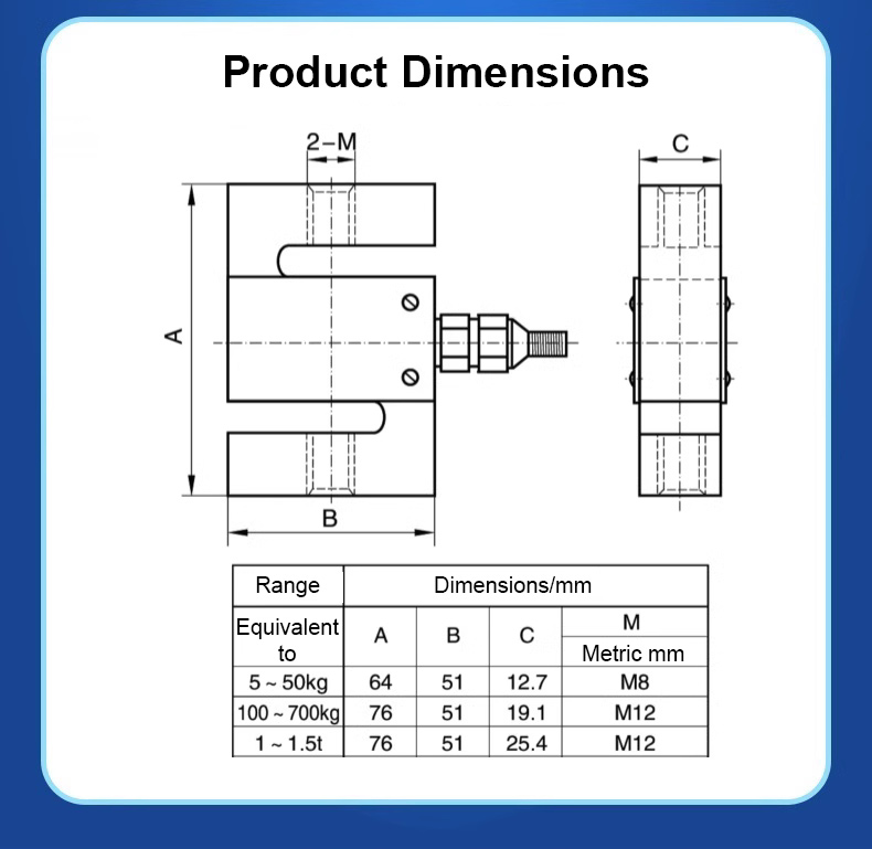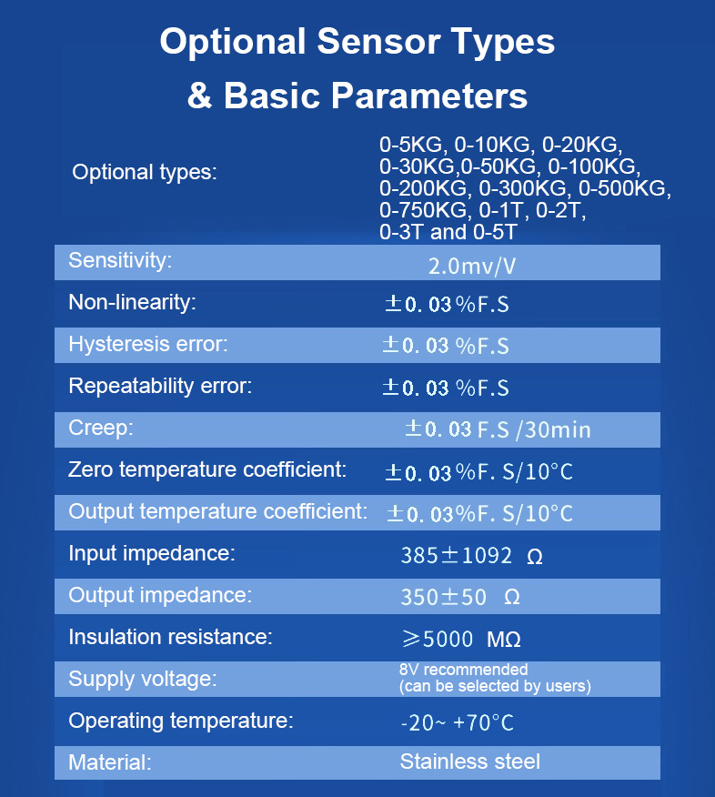 The ZNLBS series S-type tension and compression force sensors are available in a range of specifications to suit different user needs. They feature a convenient single-row, 5-digit digital display for easy reading.