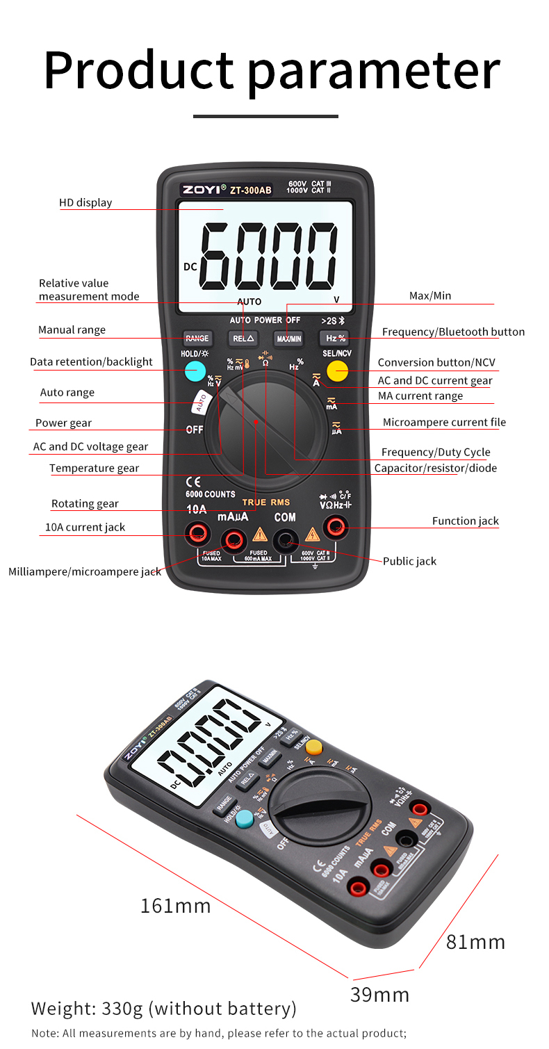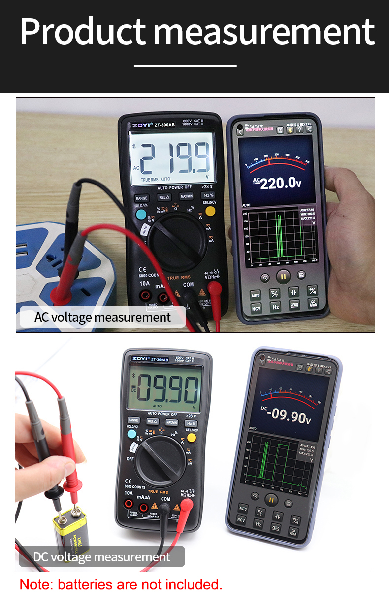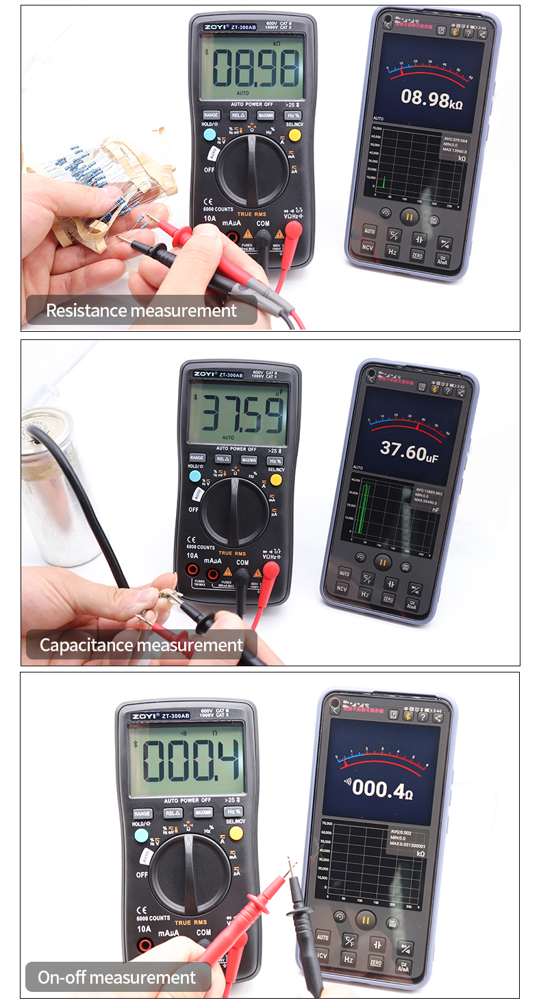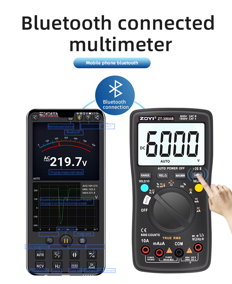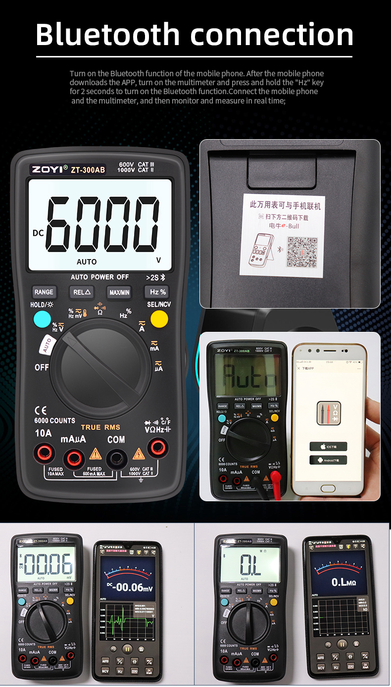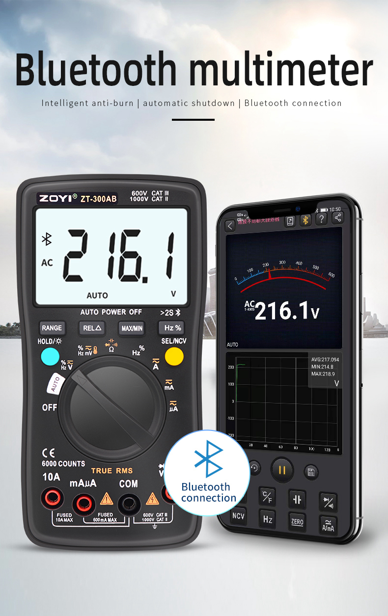 ZOYI ZT-300AB is a newly upgraded professional multimeter, which can realize remote operation and measurement through Bluetooth technology. The measurement data is visualized and recordable through the Bluetooth of the mobile phone, making it more convenient and more accurate to measure.