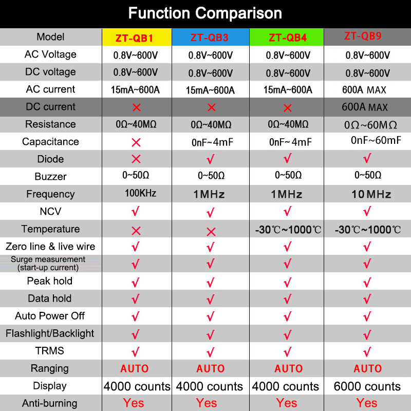 ZT-QB9 is a smart clamp meter with extremely simple panel, 600A AC/DC Current, Capacitance, Temperature, Inrush Current + Peak Hold voltage + Flashlight & Backlight. It is an ideal tool for electricians and maintenance. It enables CAT III 600V. Powerful functions include: