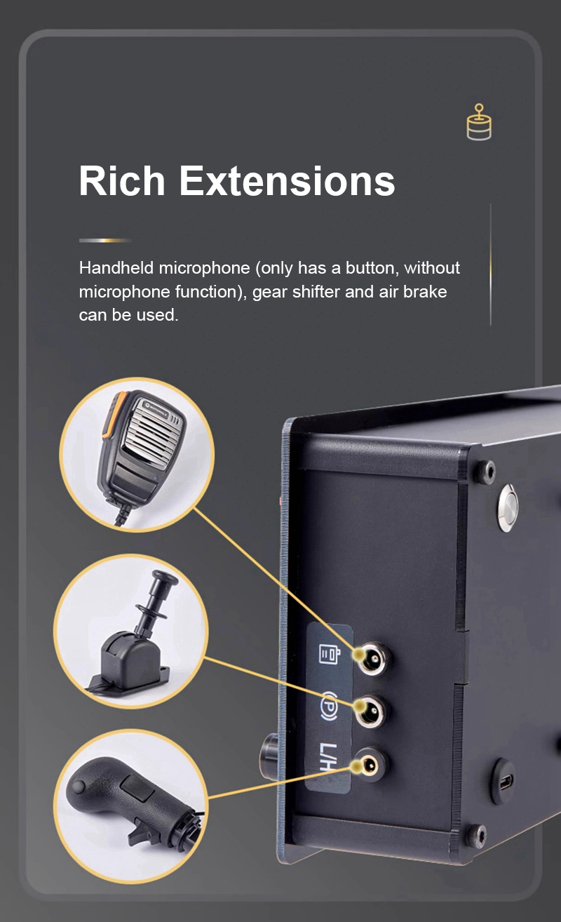 - Rich extensions redefine the button box. Handheld microphone (only has a button, without microphone function), gear shifter and air brake can be used. And the air brake base can be fixed by clamps