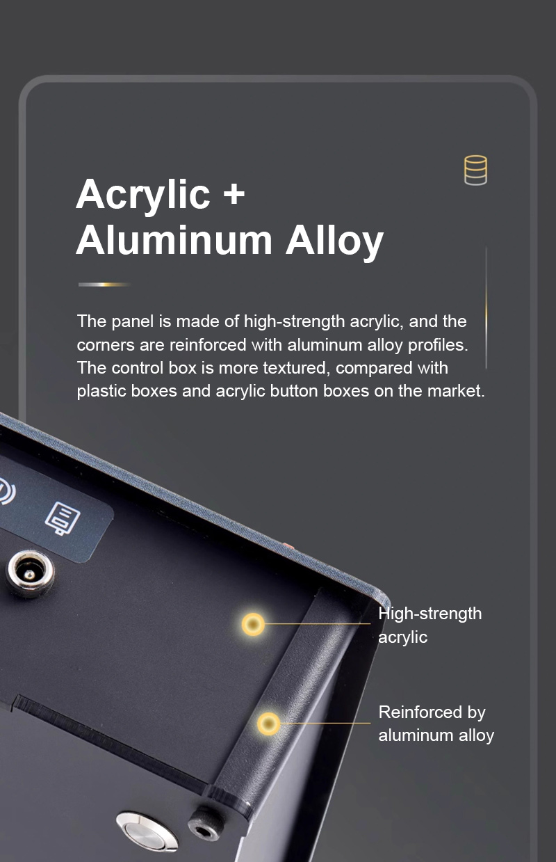 - Acrylic + aluminum alloy materials: The panel is made of high-strength acrylic, and the corners are reinforced with aluminum alloy profiles. The control box is more textured, compared with plastic boxes and acrylic button boxes on the market