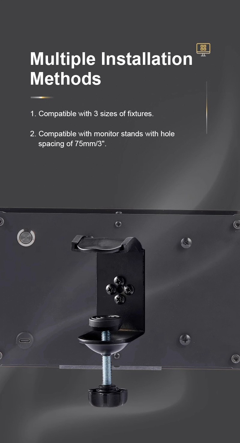 - Multiple installation methods: 1. Compatible with 3 sizes of fixtures. 2. Compatible with monitor stands with hole spacing of 75mm/3"