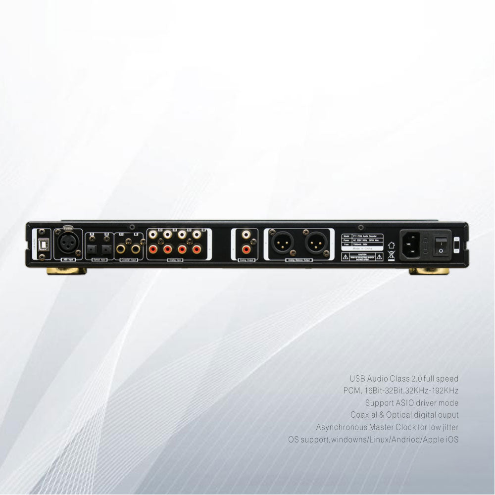 - XU208 digital interface for XMOS: Rich interfaces and full specification 192K. 4 sets of stereo RCA inputs, 2 sets of coaxial digital RCA inputs, 2 sets of optical digital inputs, 1 set of AES digital differential balanced inputs, 1 USB Audio input. Single-ended analog output and differentially balanced analog output. Currently, it can connect to 90% of audio devices. With low jitter, low latency and high sound quality.