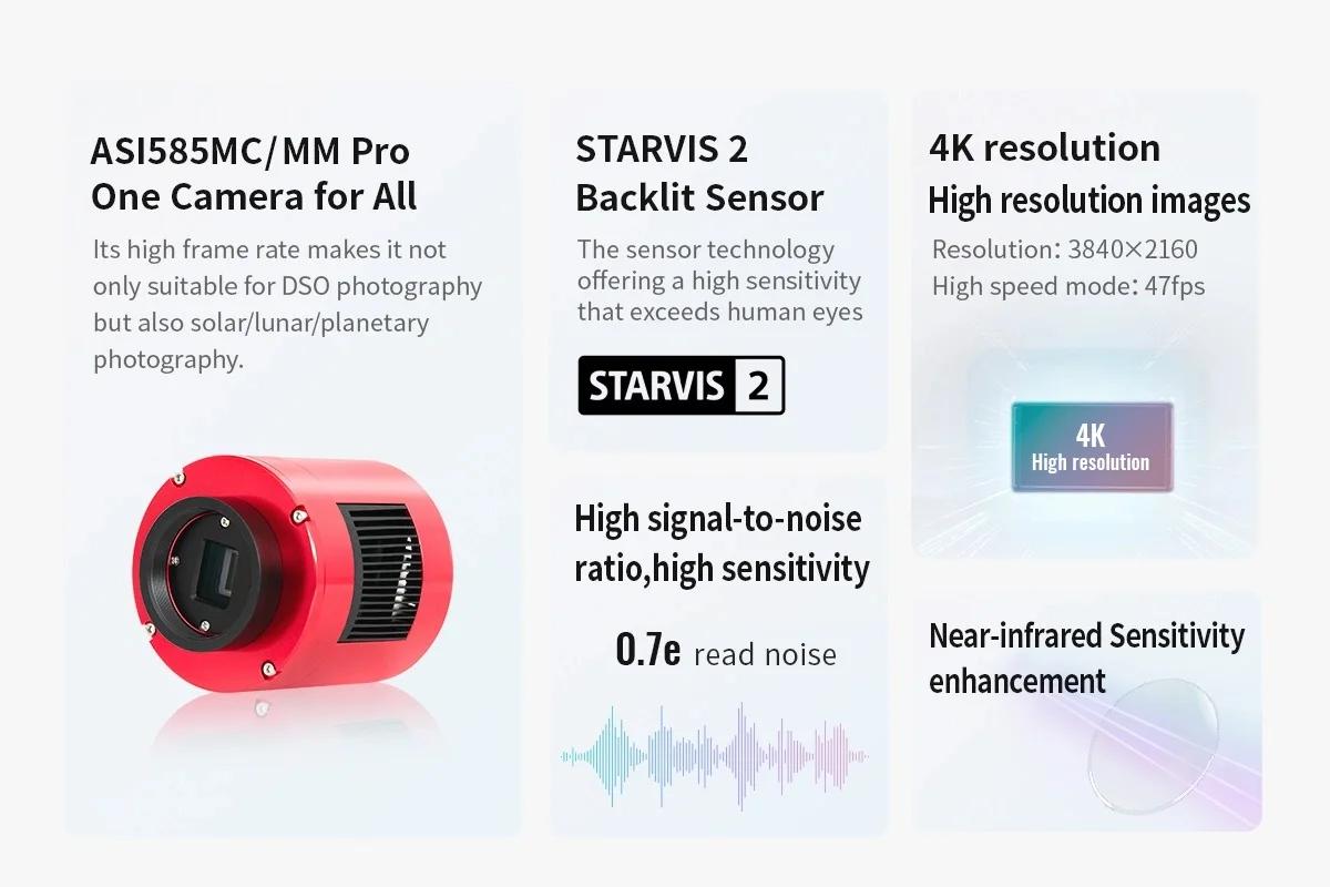 - The STARVIS 2 technology brings ASI585 Series more advanced imaging performance compared to other cooled cameras. Its high frame rate makes it not only suitable for DSO photography but also solar/lunar/planetary photography.