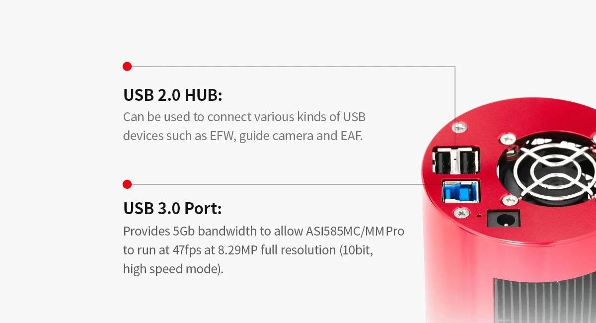 - USB 3.0 Port: Provides 5Gb bandwidth to allow ASI585 to run at 47fps at 8.29MP full resolution (10bit, high-speed mode).