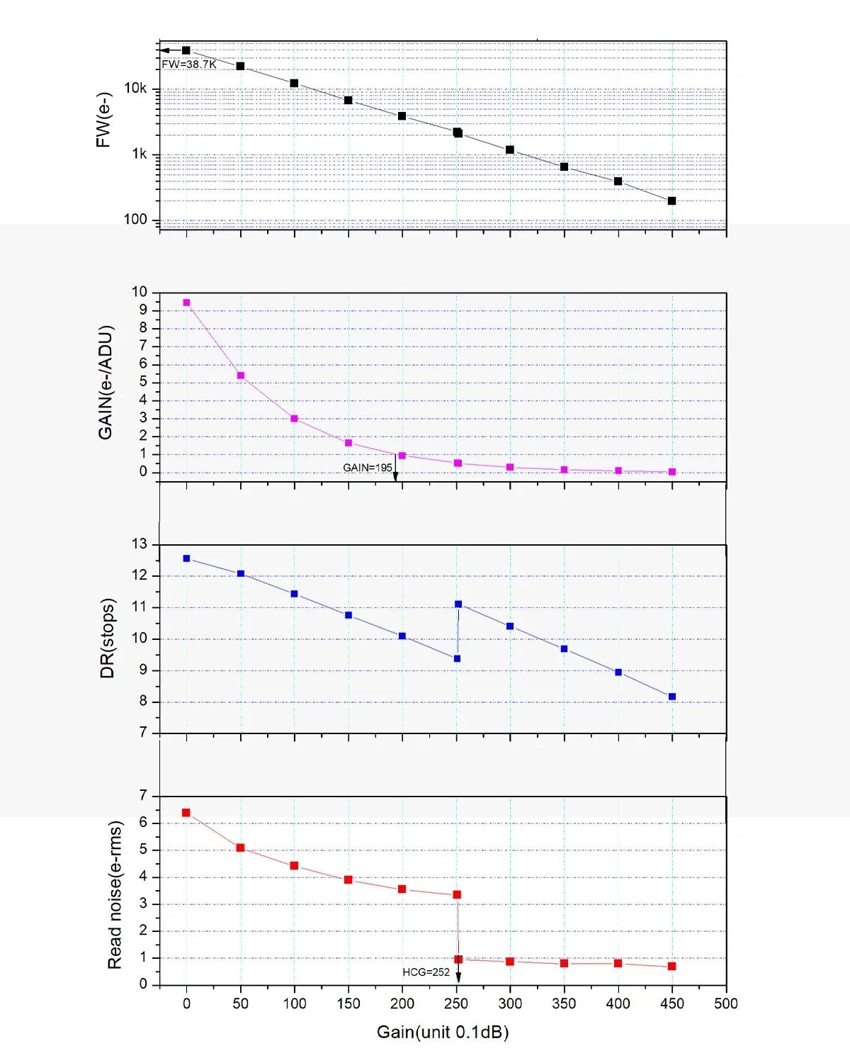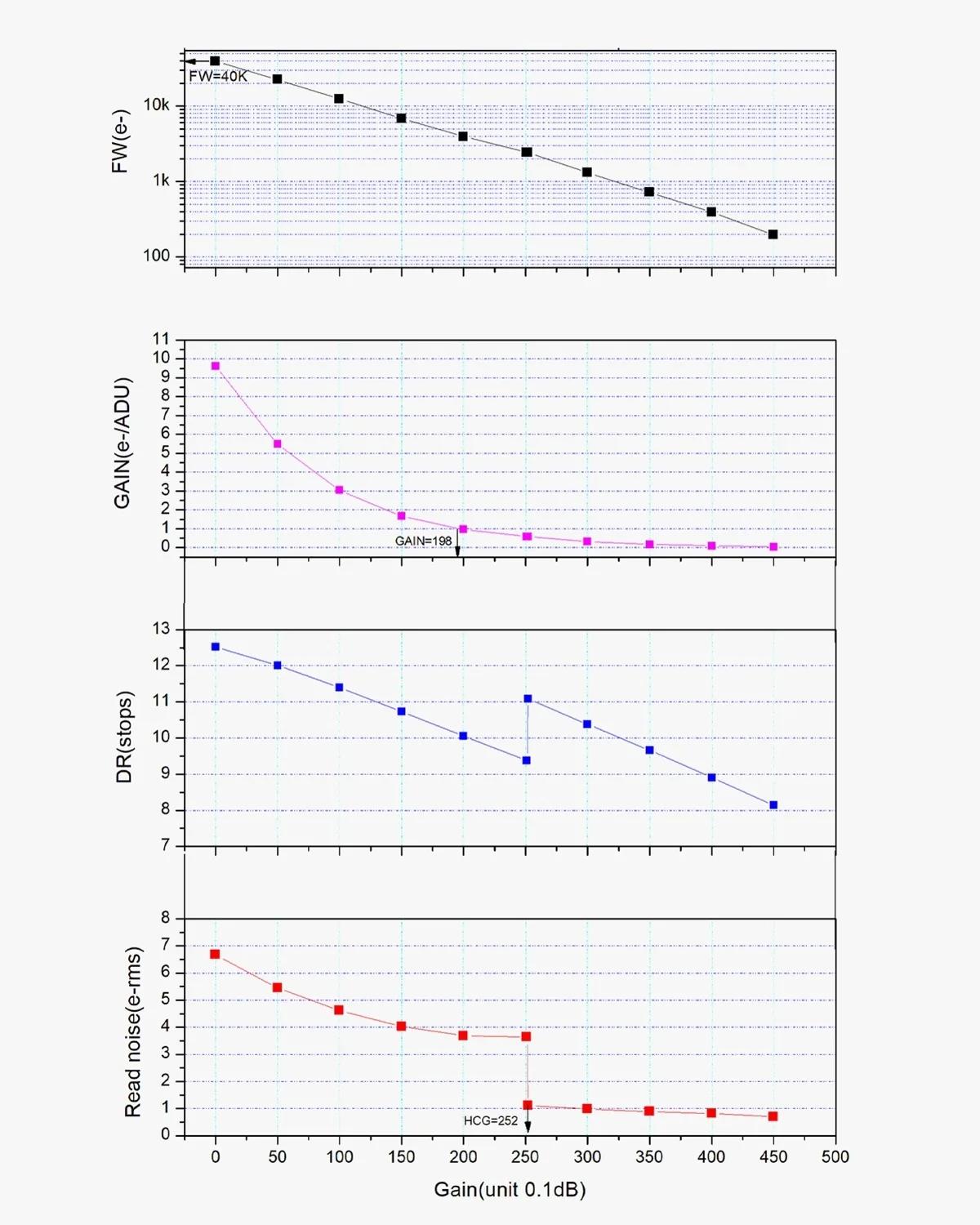 - When the gain reaches 252, the HCG mode will be automatically turned on and the dynamic range reaches a level close to 11bit. The read noise in this case can be as low as 0.7e.