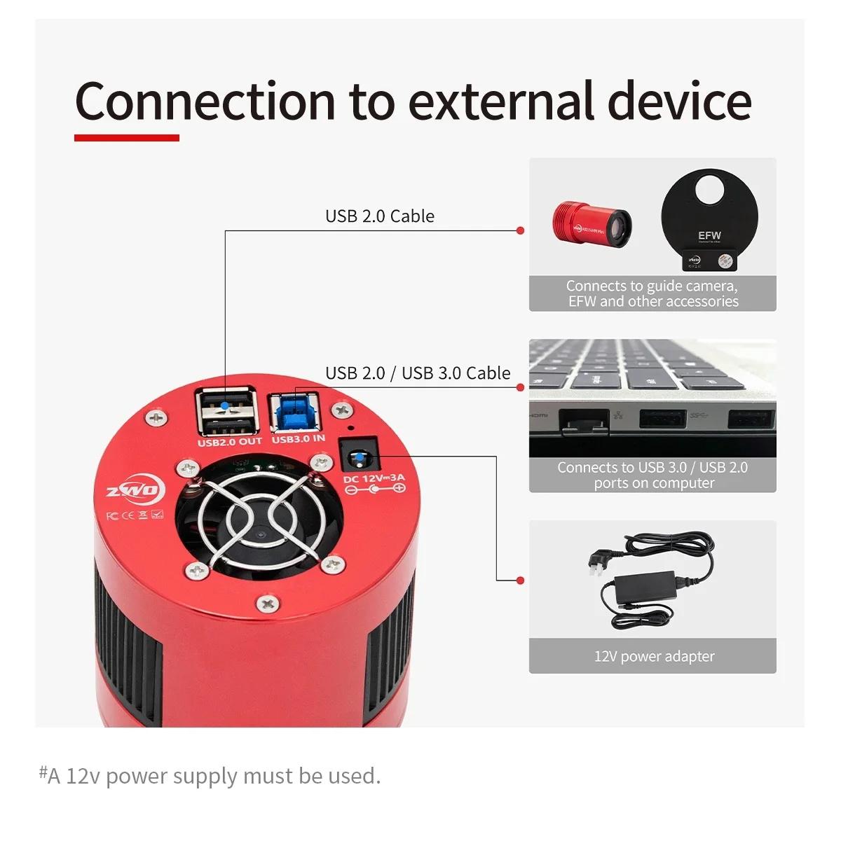 - Note: External power supplies are needed for all ASI-cooled cameras. We recommend you use a 12V@3A~5A DC adapter (D5.5x2.1mm, center pole positive) or a lithium battery (not included) with 11-14V to power the camera. Be aware that using a power supply out of this voltage range will probably lead to irreparable damage to the camera.