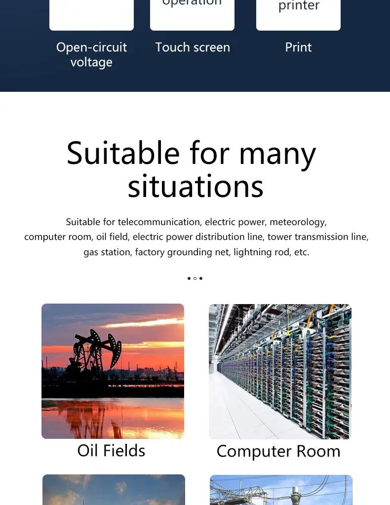 - Function: Ground resistance measurement, soil resistivity measurement, step voltage measurement, distributed potential measurement, contact voltage measurement