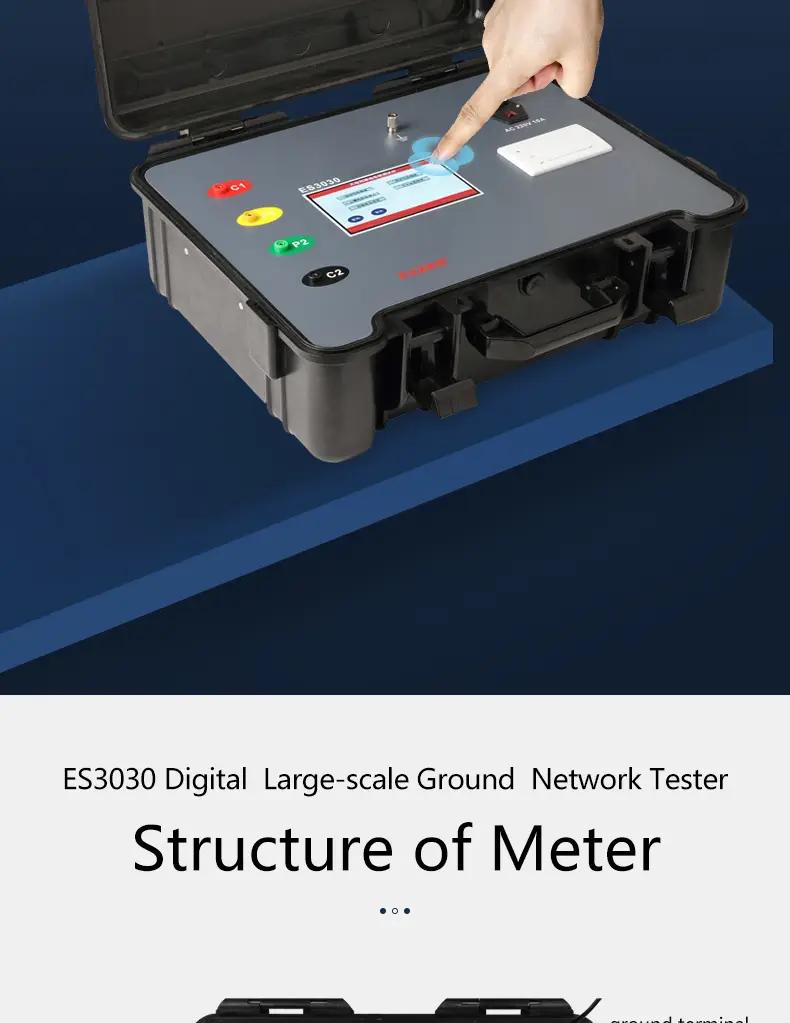 - ES3030 digital large Grounding Resistance Tester consists of a host computer, test leads, and grounding rods. It has functions such as reading, reviewing, saving, and printing historical data.