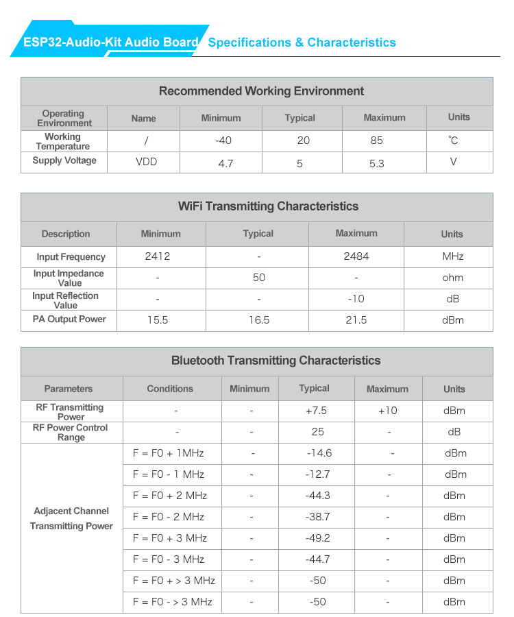 - Bluetooth: V4.2 BR/EDR and BLE standards, NZIF receiver with -98 dBm sensitivity, Class-1, Class-2 and Class-3 transmitters, supporting AFH (Adaptive Frequency Hopping), support CVSD and SBC audio formats