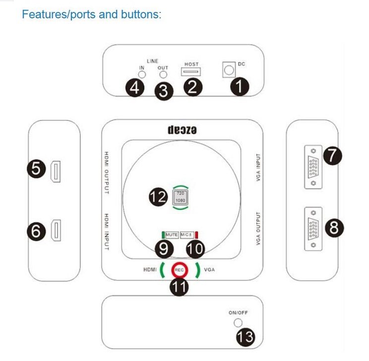- User Interface:Record button,720p/1080p switch button,microphone gain set button,microphone mute button;LED indicator for working status;Power on/off button