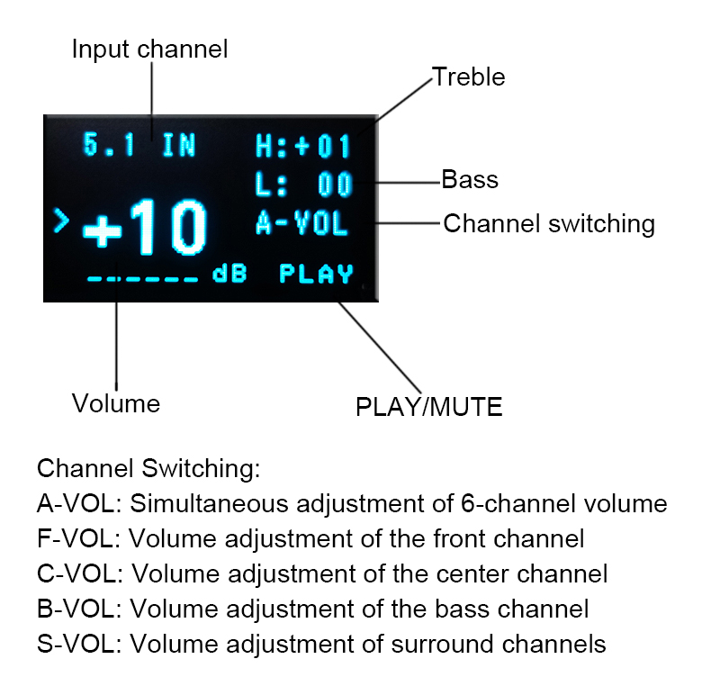 The arrow points to the display when the maximum number is displayed to adjust the volume. The default rotation function is to turn up/down the volume of all 6 channels. If you want to control the volume of a channel separately, please use the remote control's 6-channel switching button to switch, and then rotate the volume potentiometer