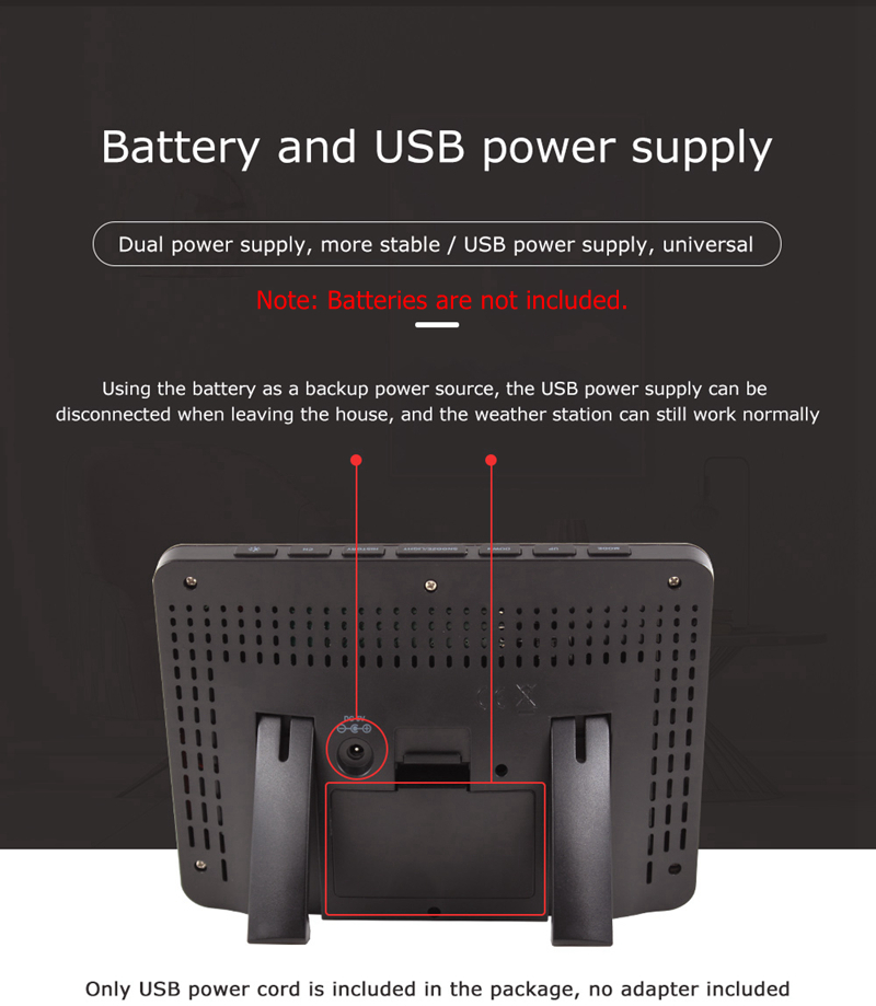 - Weather station main unit and wireless sensors are powered by 2x1.5V AA batteries separately. Batteries are not included. Batteries can work as backup power supply. When you are away from home, you can disconnect USB power supply, and it works normally.