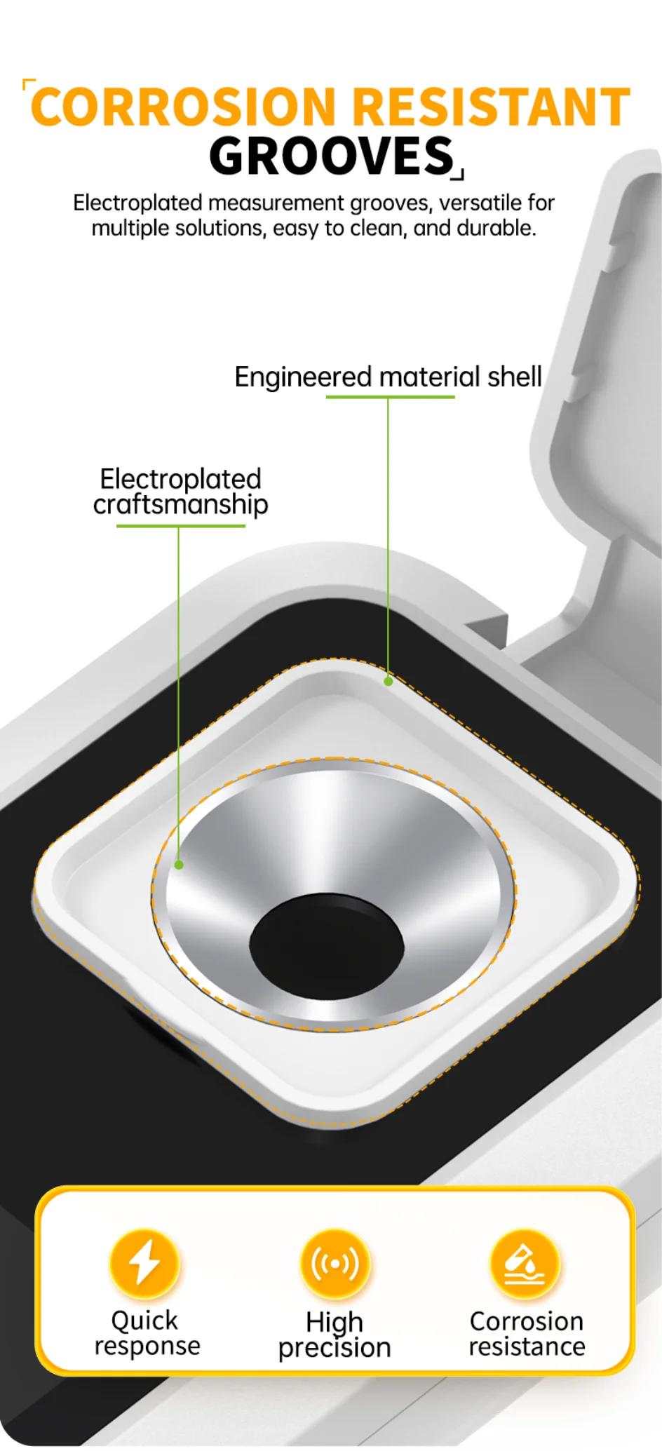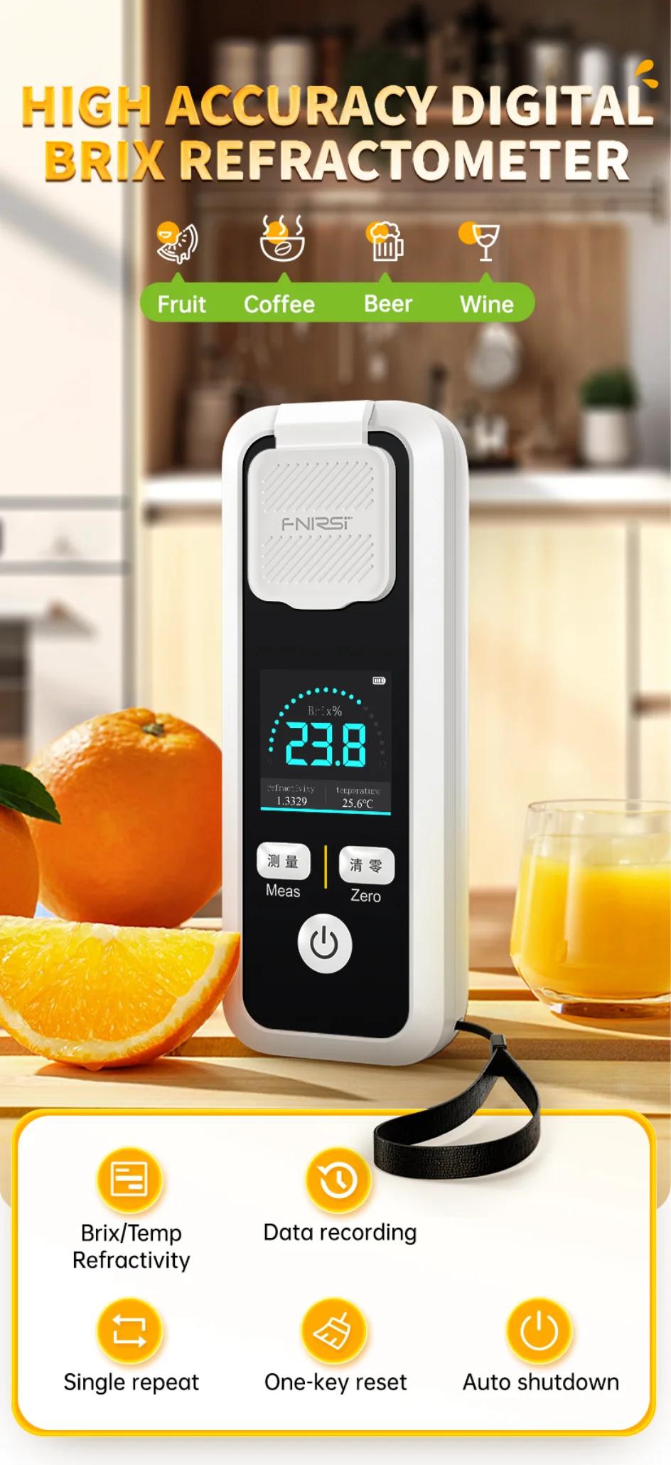 - This product is an instrument used to measure the sugar concentration in juices, alcoholic beverages, and other solutions. It features a high definition color screen display, rich measurement parameters, wide measurement range, and high accuracy. It is suitable for quickly detecting various concentrations of sugar solutions and widely used in the fields of beverages, food, sugar production, alcoholic beverages, agriculture, etc., to control the production process and ensure product quality.