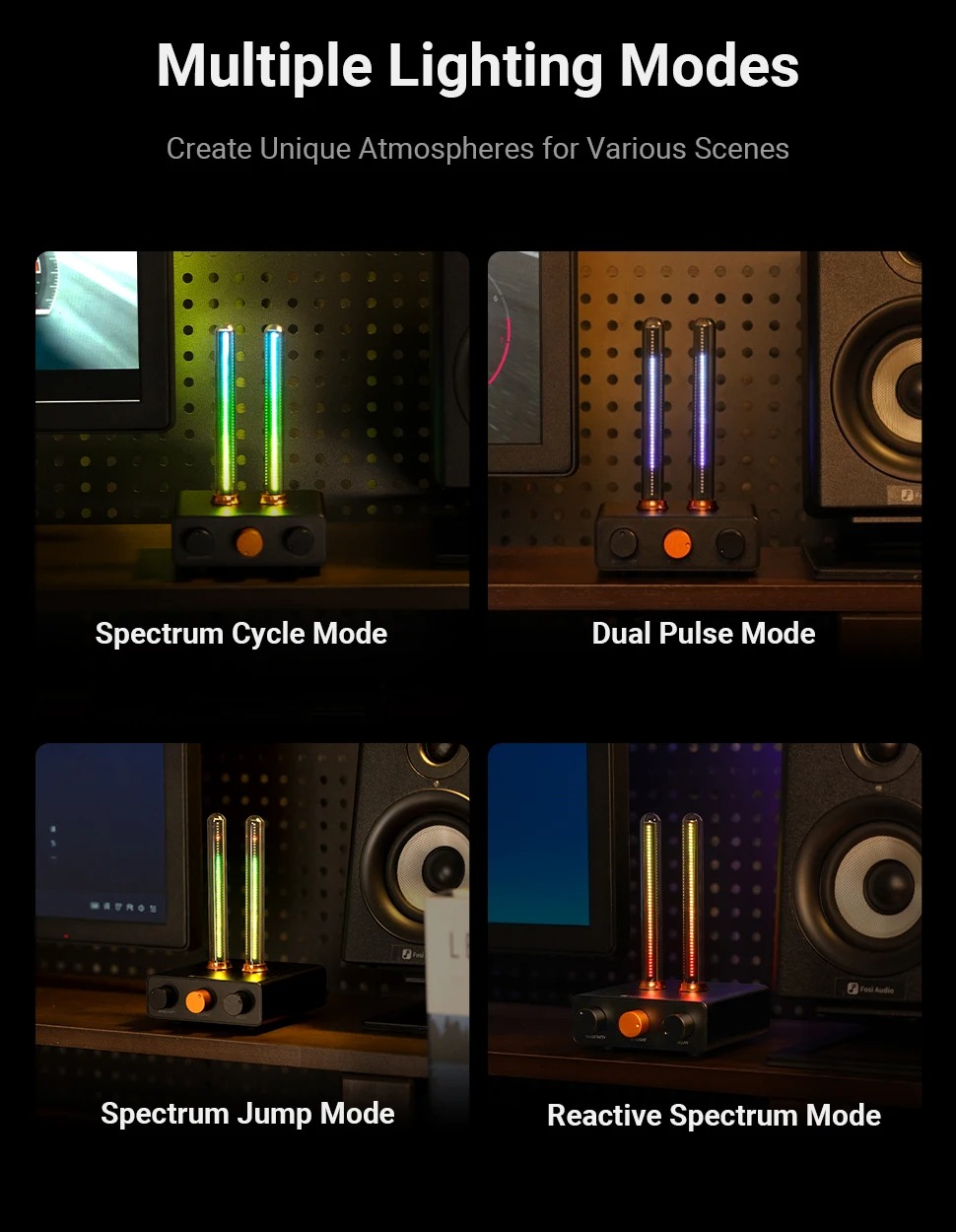 * The Fosi Audio Visualizer is more than just a lighting accessory—it is a gateway to a multi-sensory experience. Designed as a unique companion for your home theater amplifier, this ambient light syncs its vibrant RGB colors with the rhythm of your music, creating a dynamic and immersive atmosphere. Whether you're working, relaxing, or entertaining, the Fosi Audio AH-01A adds elegance and creativity to any space. Its compact and versatile design makes it ideal for desktops, living rooms, and parties.