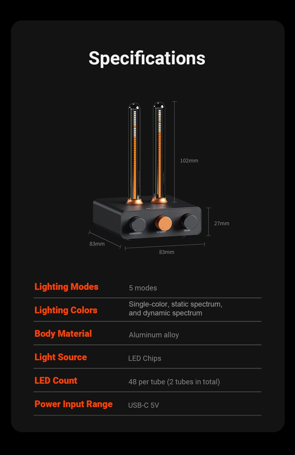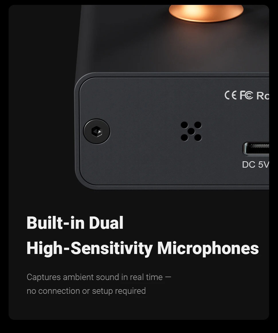 * Crafted from full aluminum alloy using precision CNC machining, the Fosi Audio Visualizer combines premium durability with sophisticated aesthetics. The anodized finish adds a warm, smooth texture that's resistant to wear and pleasing to the touch. Despite its compact form, the unit is solidly built—offering long-lasting performance and timeless style. Accented with classic brass edging, its retro-modern design elevates your décor, making it not just a lighting tool, but also a tasteful artistic statement.