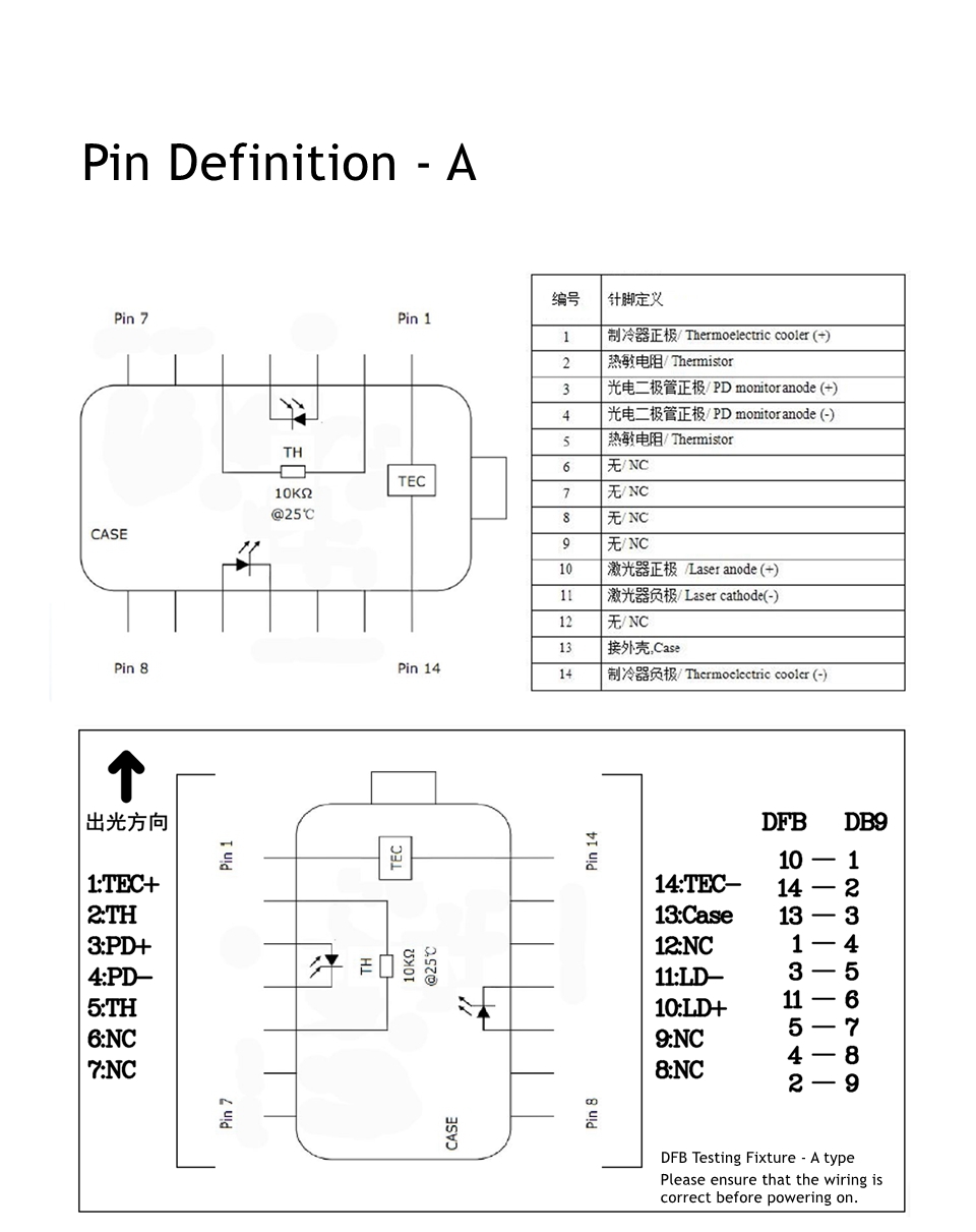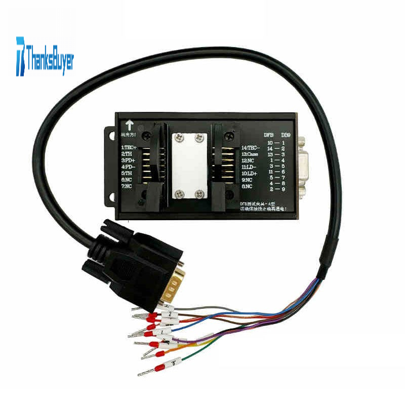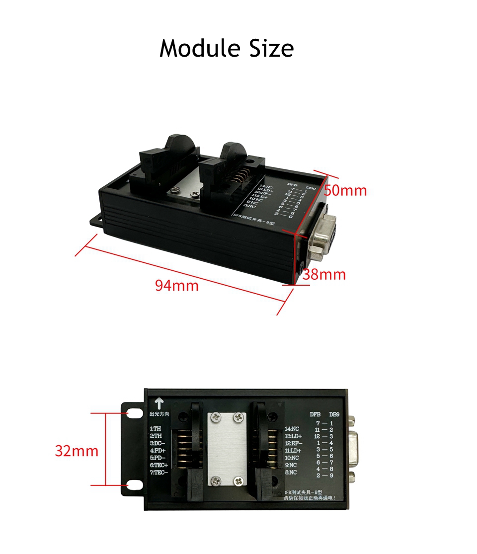 - The fixture pins are plated with gold on the surface of spring steel to reduce contact impedance. The DB9 interface is convenient for connecting with testing instruments. The fixture is in contact with the aluminum block of the laser base for effective heat dissipation. The housing positioning design is easy to fix with the optical platform. The main application of DFB related test benches is to build fixtures for laser detection during mass production.