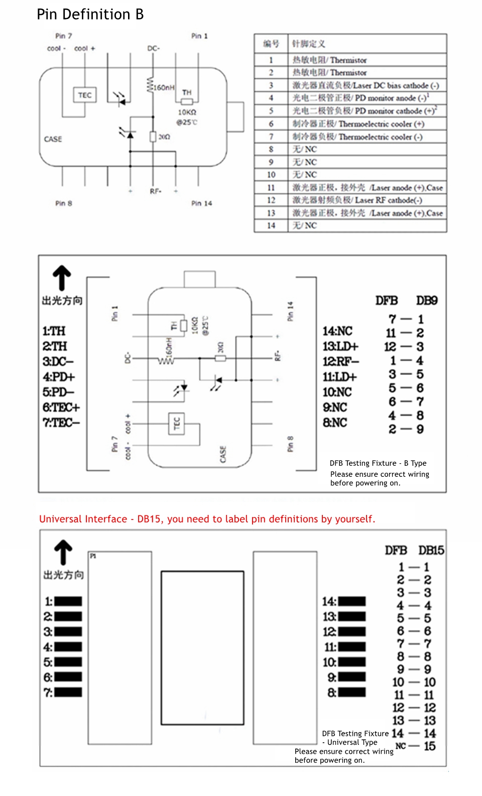 - The fixture is developed and designed for the standard distributed feedback laser DFB, suitable for commonly used 14PIN small butterfly packaged lasers. The fixture provides two commonly packaged pin definitions, and for special pin definitions, a universal adapter (DFB-E-DB15) can be used. The use of DFB fixtures allows for testing, debugging, and experimentation of the laser without the need for welding, avoiding damage and failure of the laser caused by pin misconnection. Suitable for use by a wide range of research institutes, universities, and related production enterprises.