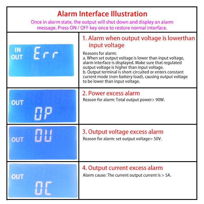It is a boost module. If output voltage is lower than input voltage, it will display this interface and automatically enter output shutdown state. If you encounter this alarm interface during use, it may be because of the following reasons: